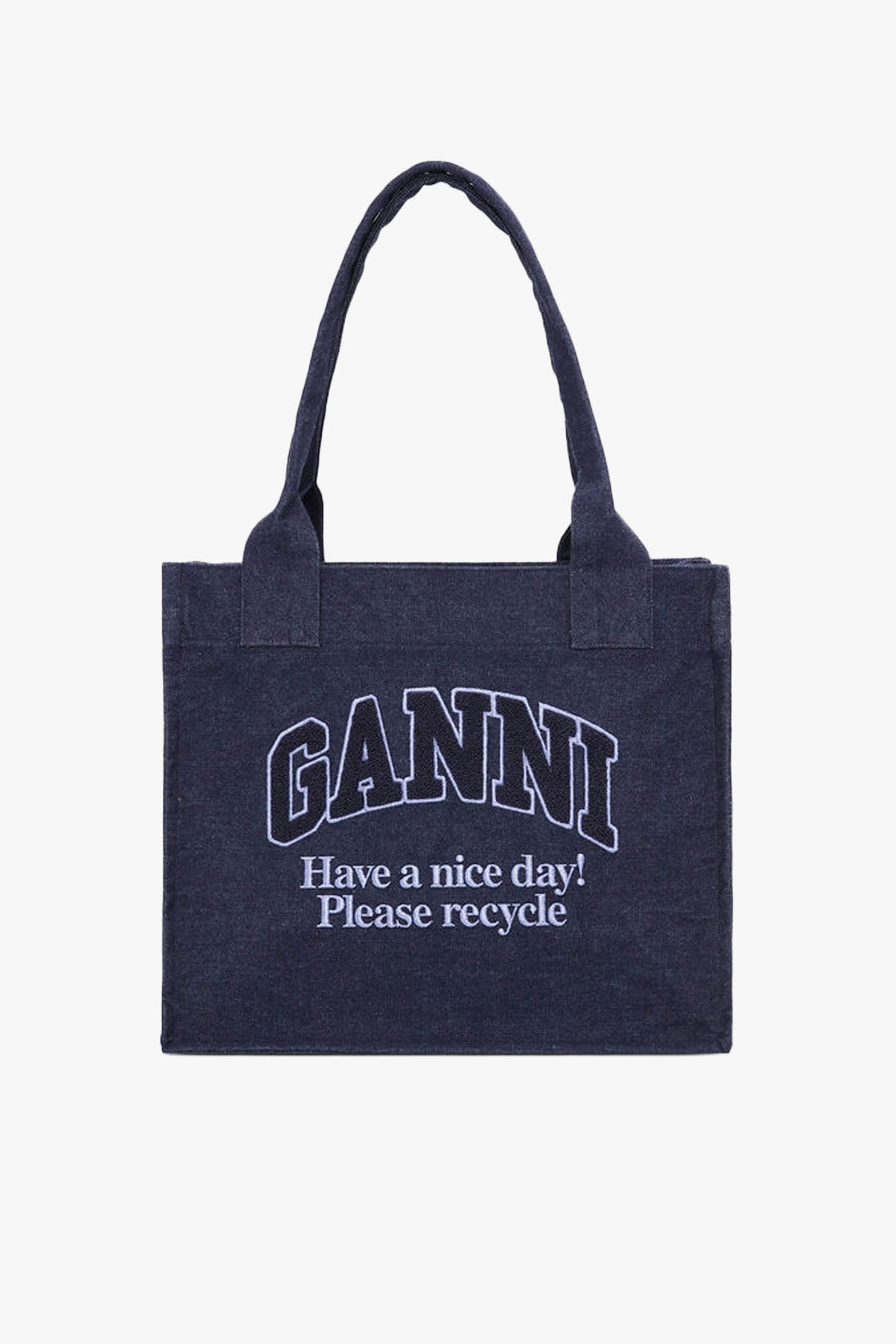 This Denim Large Tote Bag is designed in a rectangular shape and features two handles and an embroidered GANNI logo.