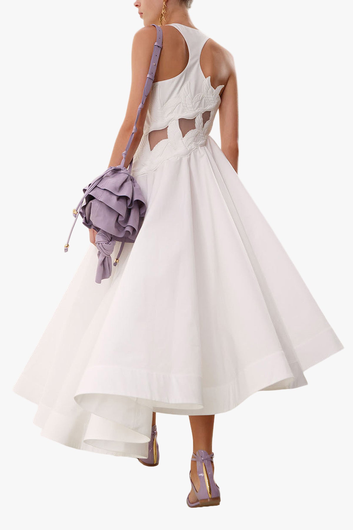 Luna Appliqué Midi Dress fra Zimmermann er en del av Spring 2026-kolleksjonen Kindred Spirit. Kjolen er laget i bomull og har en feminin silhuett med V-utringning og racerback. Broderte fugledetaljer og utskårne applikasjoner gir designet et dekorativt preg, mens det asymmetriske skjørtet skaper flott bevegelse.