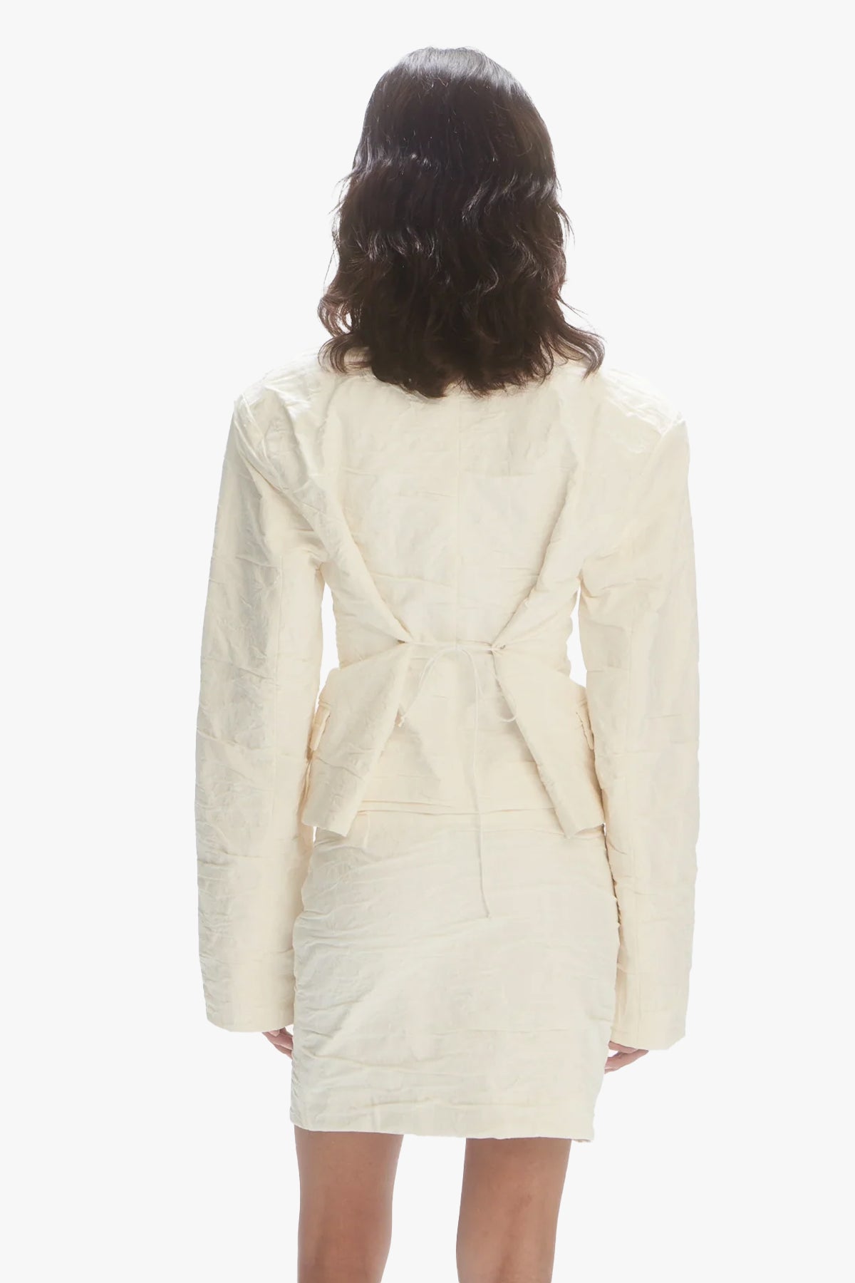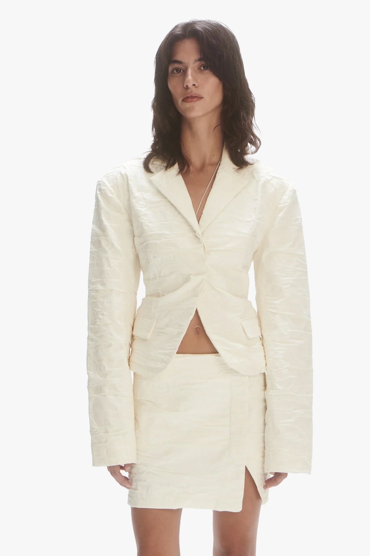 Overlap low-waist mini skirt in a 3D crushed cotton flower cloak from Italian mill Inseta. The model is wearing size S. The material is 100% cotton.