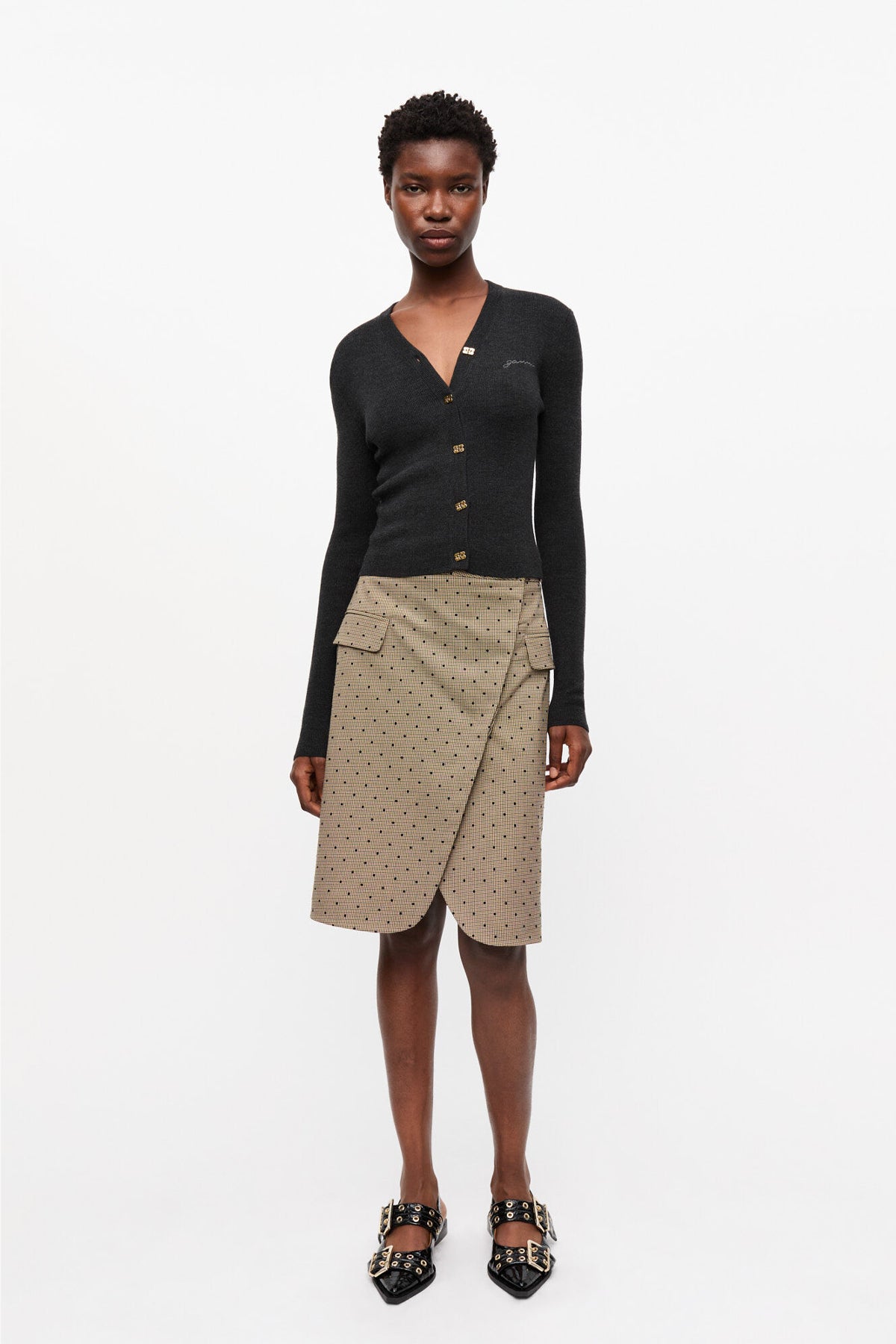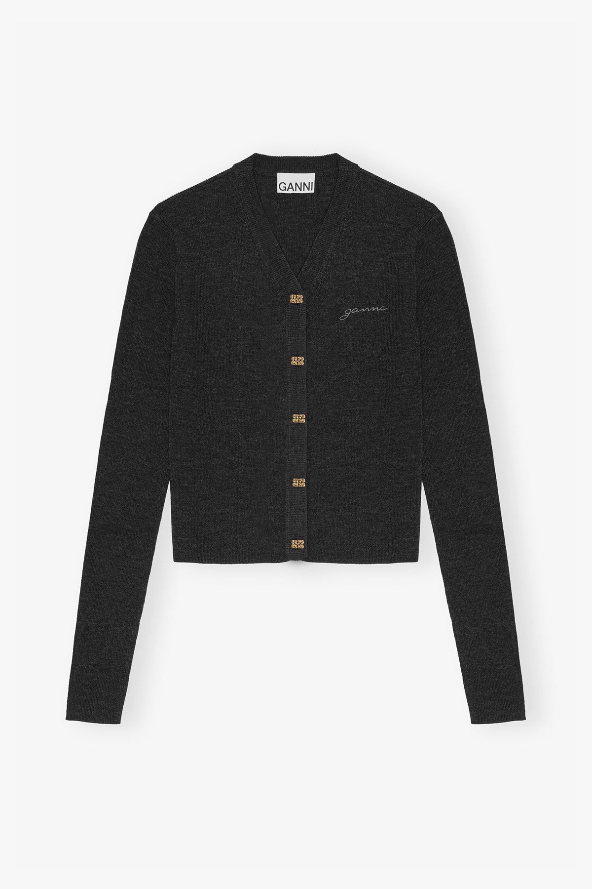 A timeless wardrobe staple with a refined touch. Crafted from 100% merino wool, this black ribbed cardigan features a V-neckline, a structured collar, and a front button closure. Finished with a subtle embroidered GANNI logo, it's perfect for effortless layering.