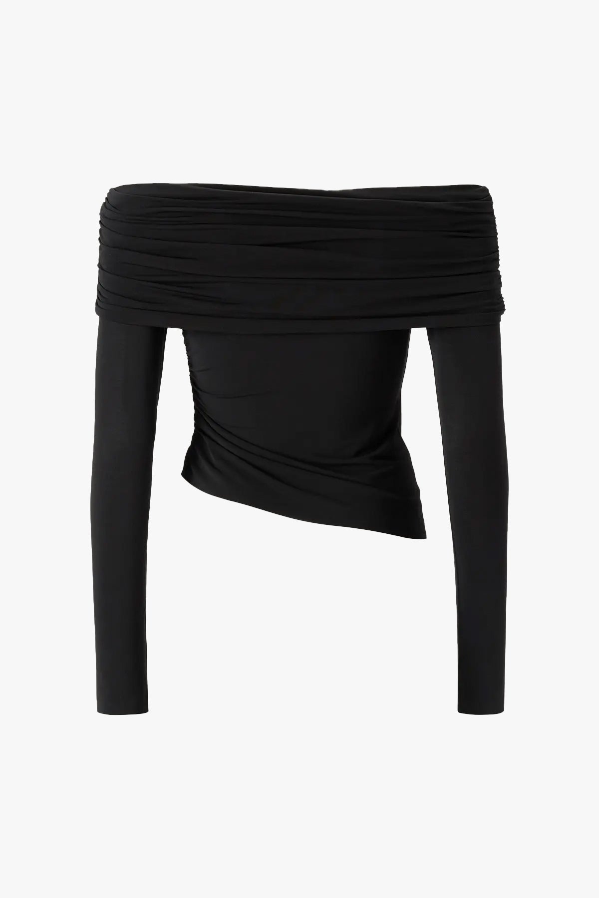 The Off-Shoulder Top is designed with gathering on the left side and a slightly slanted hem. Featuring long sleeves with raw edges, this top is crafted from a soft and stretchy fabric for a flattering fit.