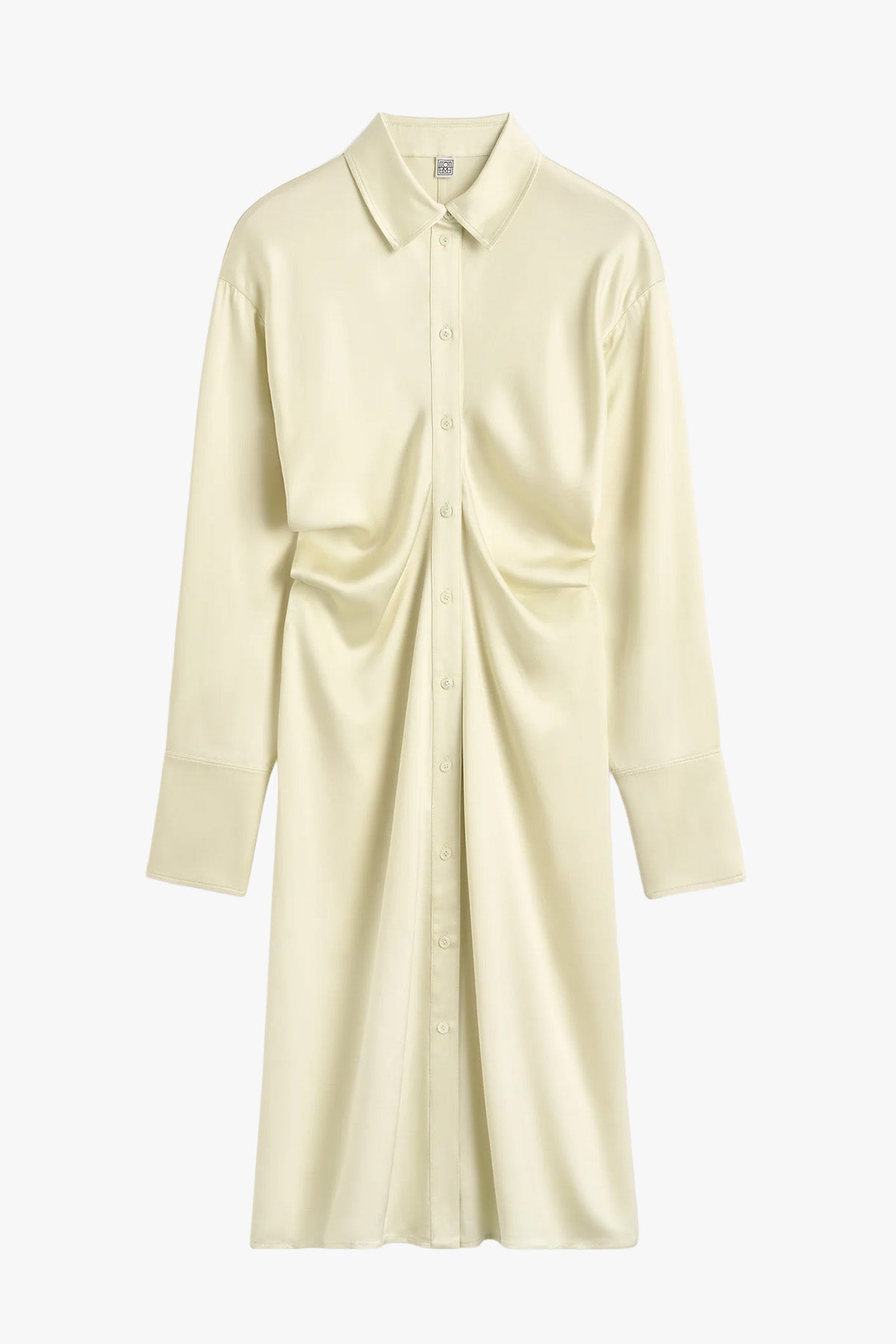 Our iconic slouchy waist detail returns in this modern shirt dress, crafted from refined crepe-back satin. The dress features a pointed collar and button fastening to match the cuffs, and a slim waist for a flattering fit. Style with white accessories for a modern contrast.
