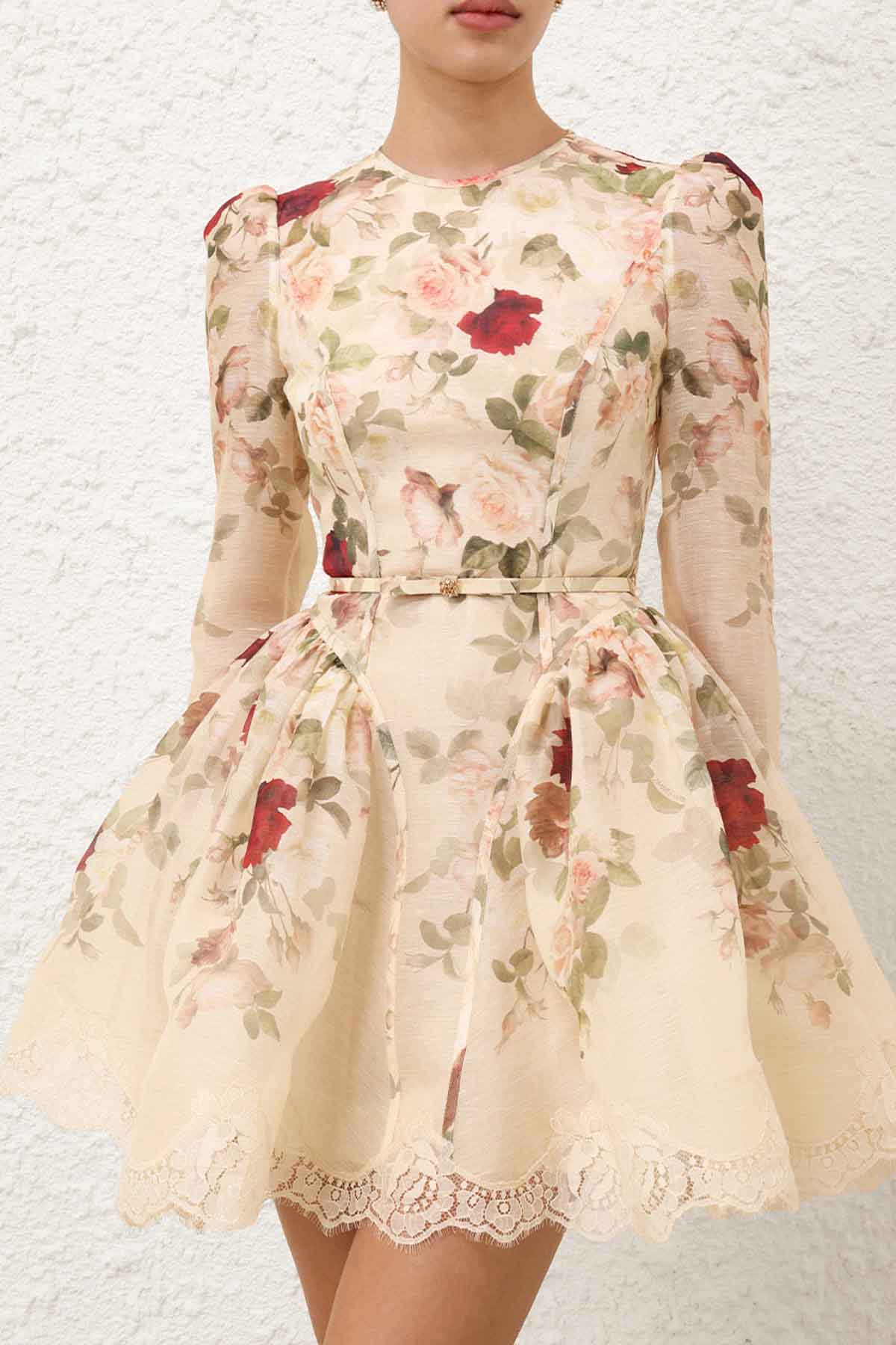 The Hypnotic Lace Trim Mini Dress in Cream Cascade from our Fall 2025 Collection, Hypnotic. A silk linen mini dress featuring a rounded neckline, long sleeves, and lace trim at the neckline, cuffs, and hem, finished with a full flared skirt.