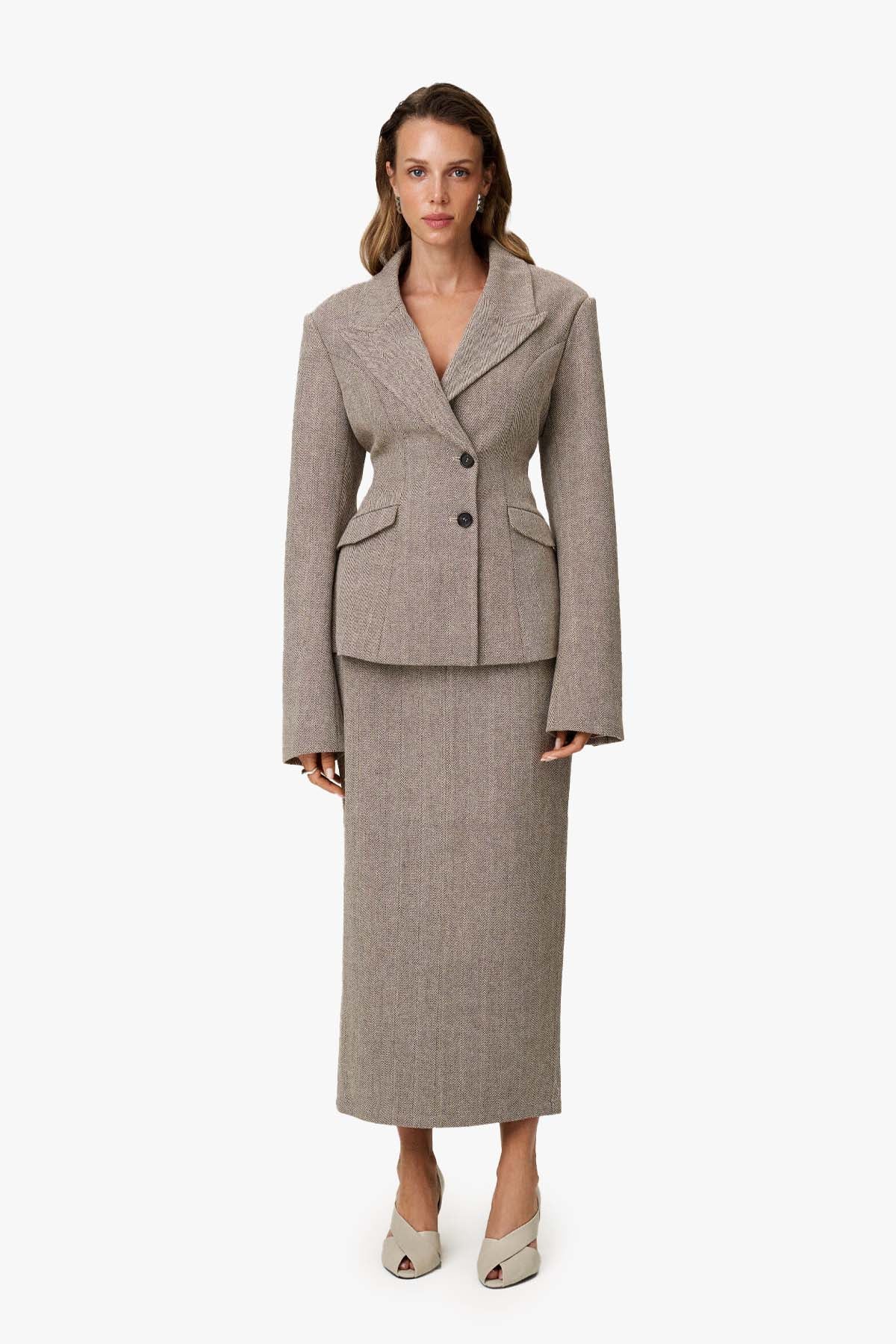 Stockholm blazer features a structured silhouette with straight shoulders and a snatched waist, accentuated by a thin suede belt. Designed with a classic notched collar, two-button closure, and double-sleeve detailing for a refined touch. Fully lined for comfort, it also includes two front pockets and a back slit for ease of movement.