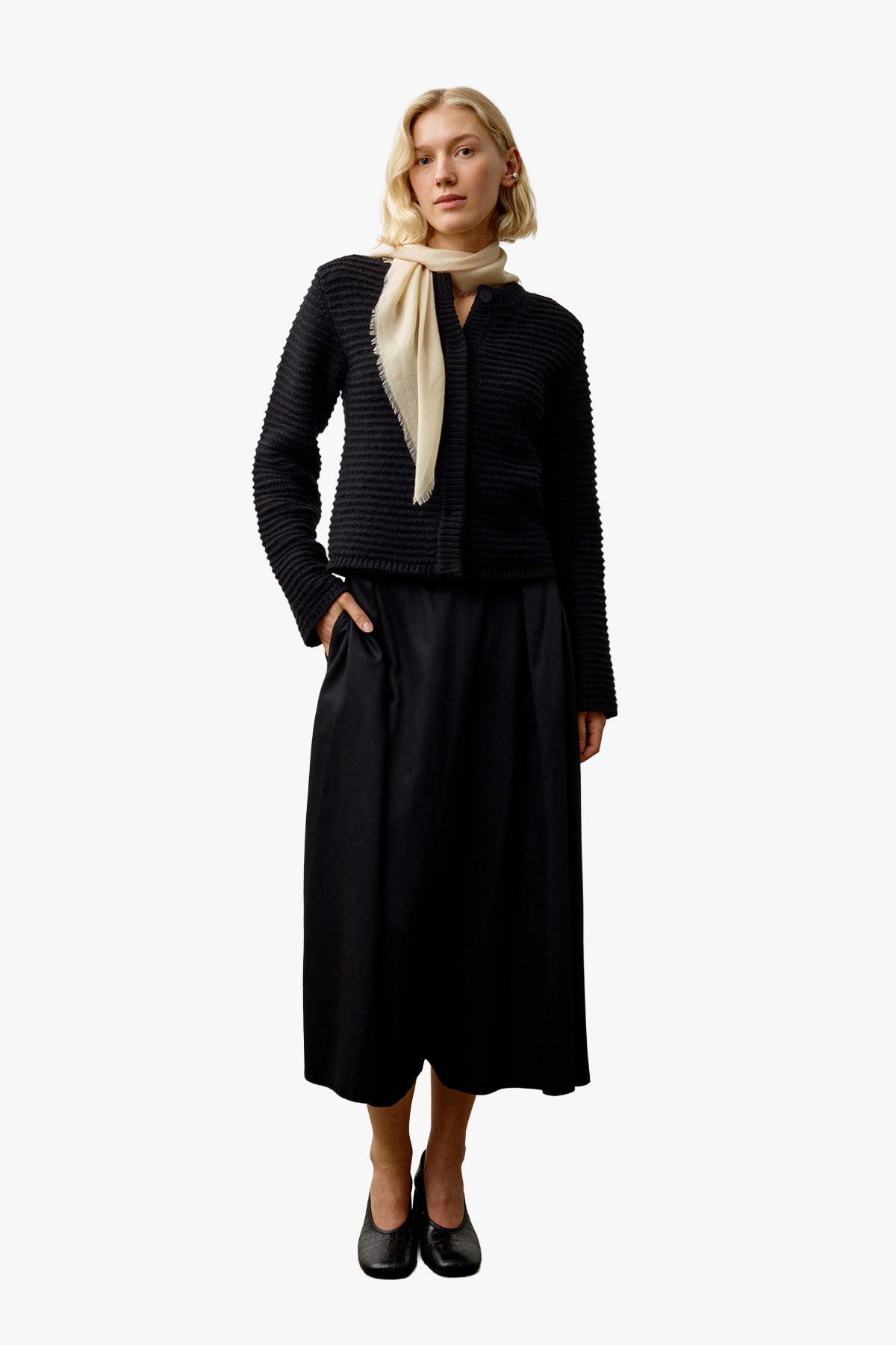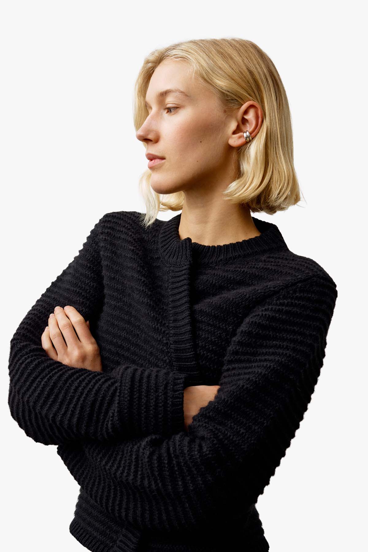 Snø No. 2 is a sophisticated sweater made from ultra-fine merino wool and cashmere. It is knitted in different yarns and techniques that give the stripes an elegant 3D effect. Hidden snaps give a minimalist look, while luxurious materials make the garment both soft and exclusive.