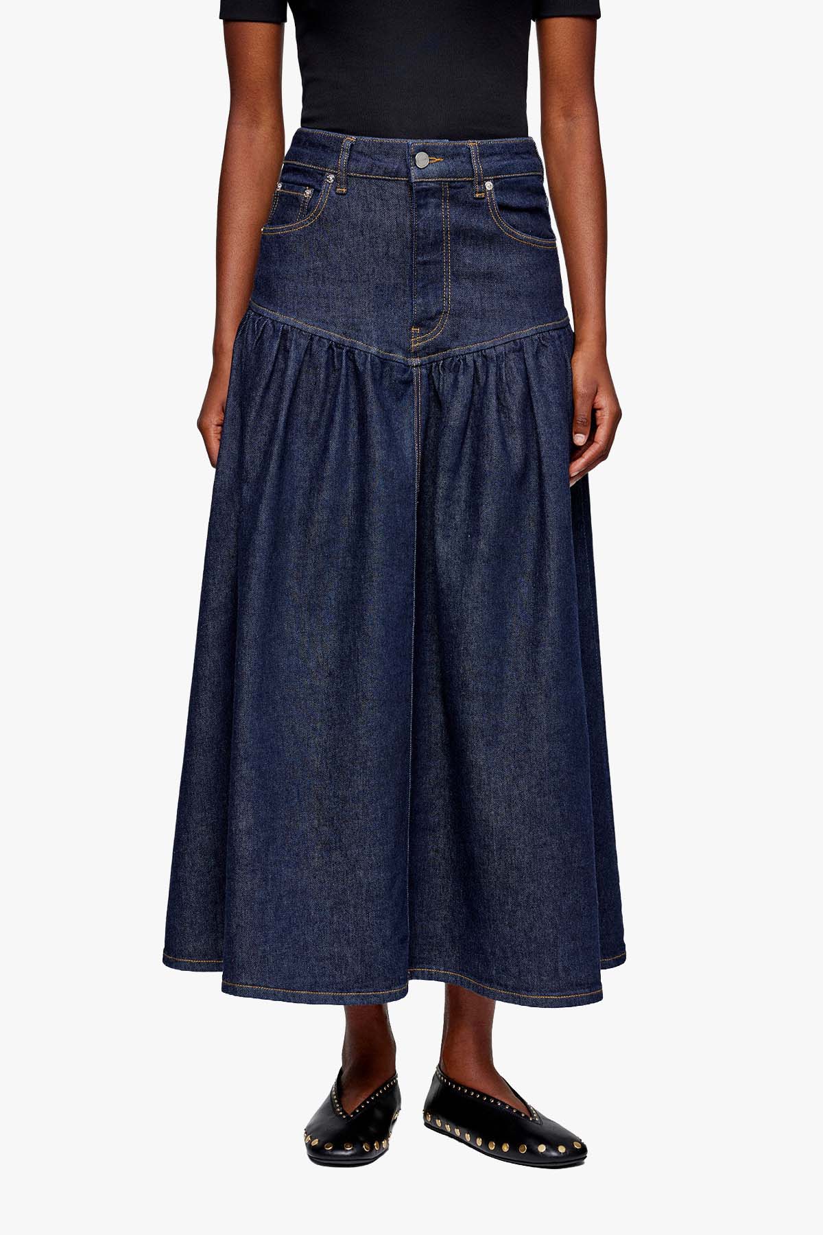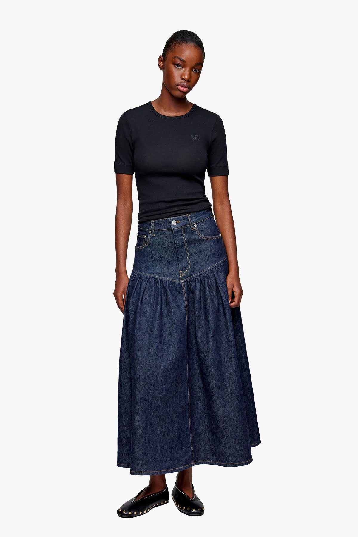 Denne denimskjørtet fra GANNI har høyt liv og en lang silhuett med vidde. Overdelen har klassiske jeansdetaljer, mens den rynkede skjørtedelen gir mer bevegelse. Et anvendelig plagg som kan styles med både strikk og skjorte.