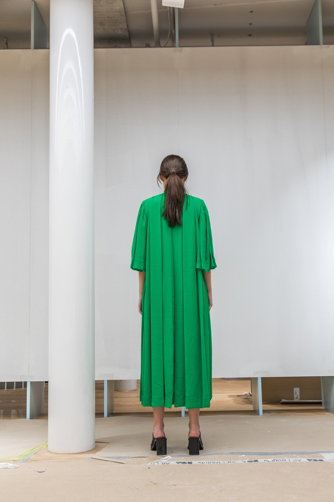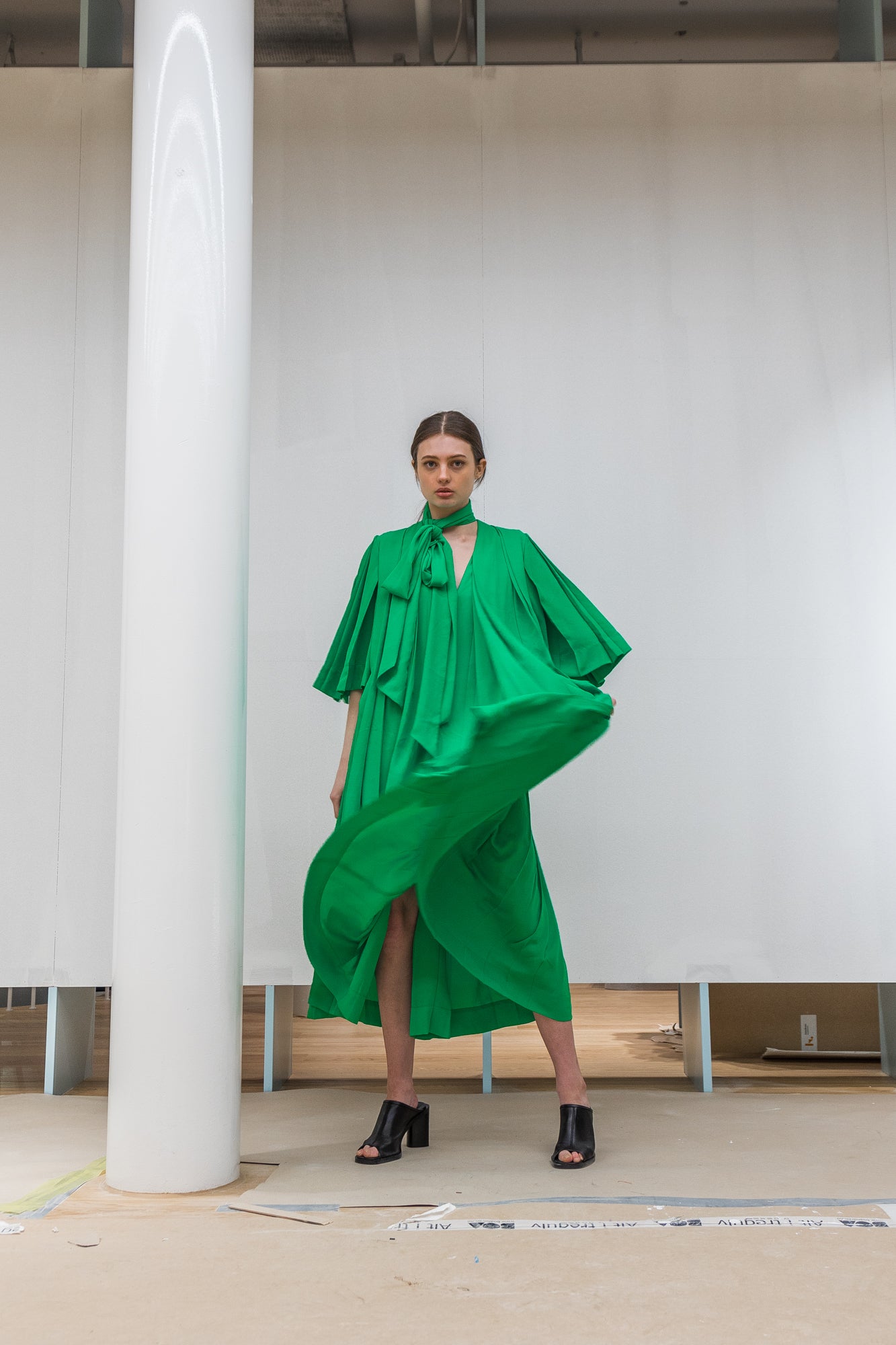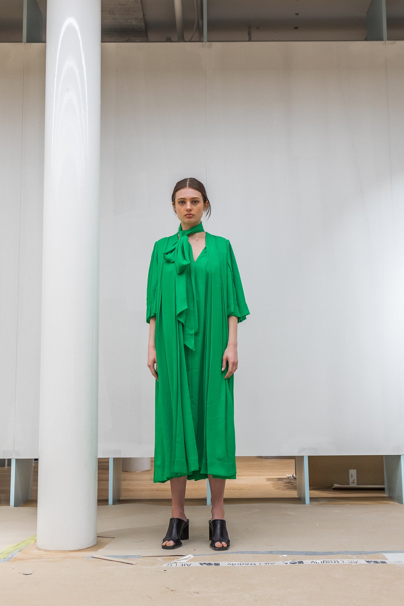 This romantic blouse is adorned with a billowing scarf detail that flutters as you move. Made of silk crepe de chine in an apple green colour.