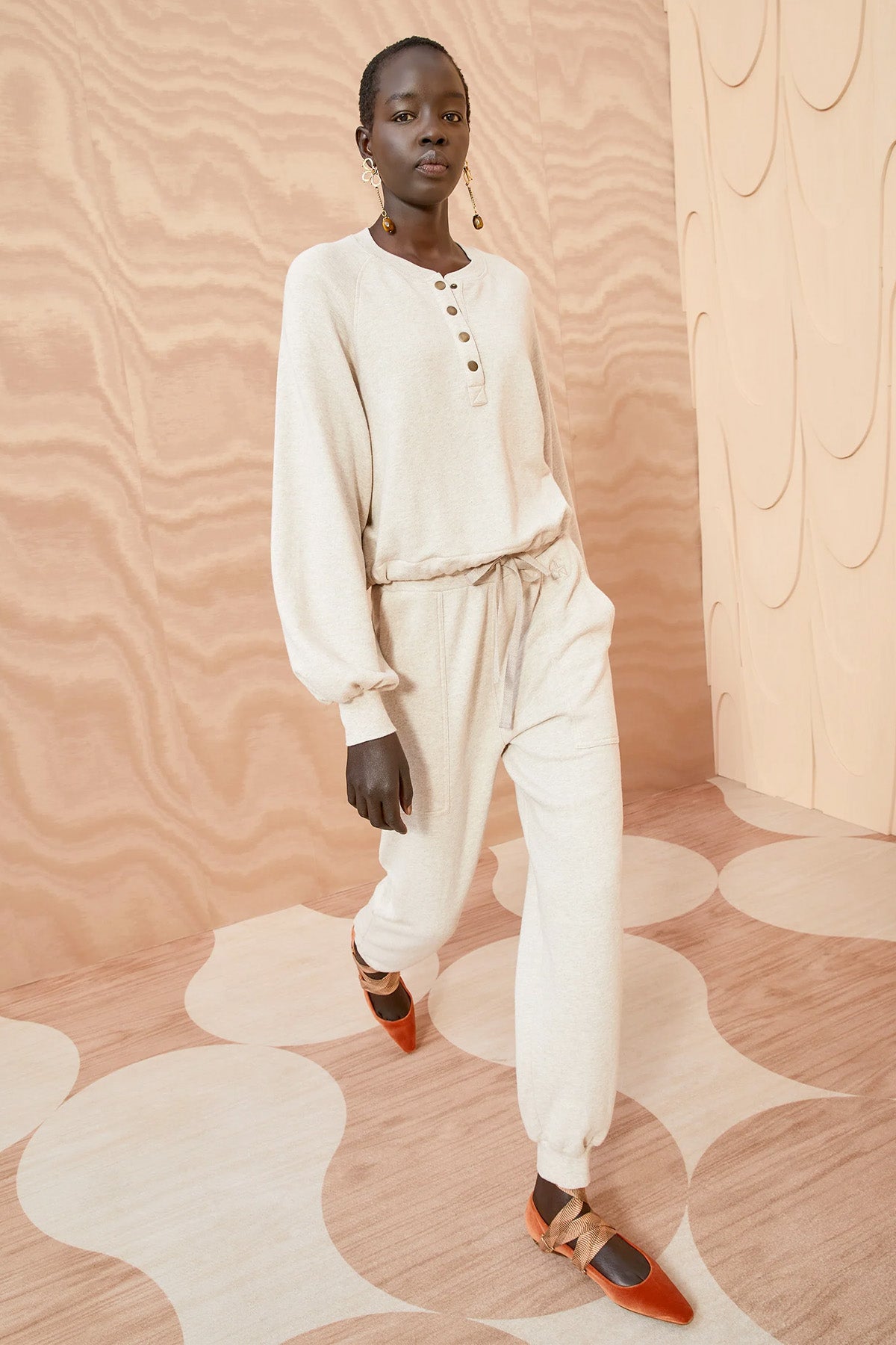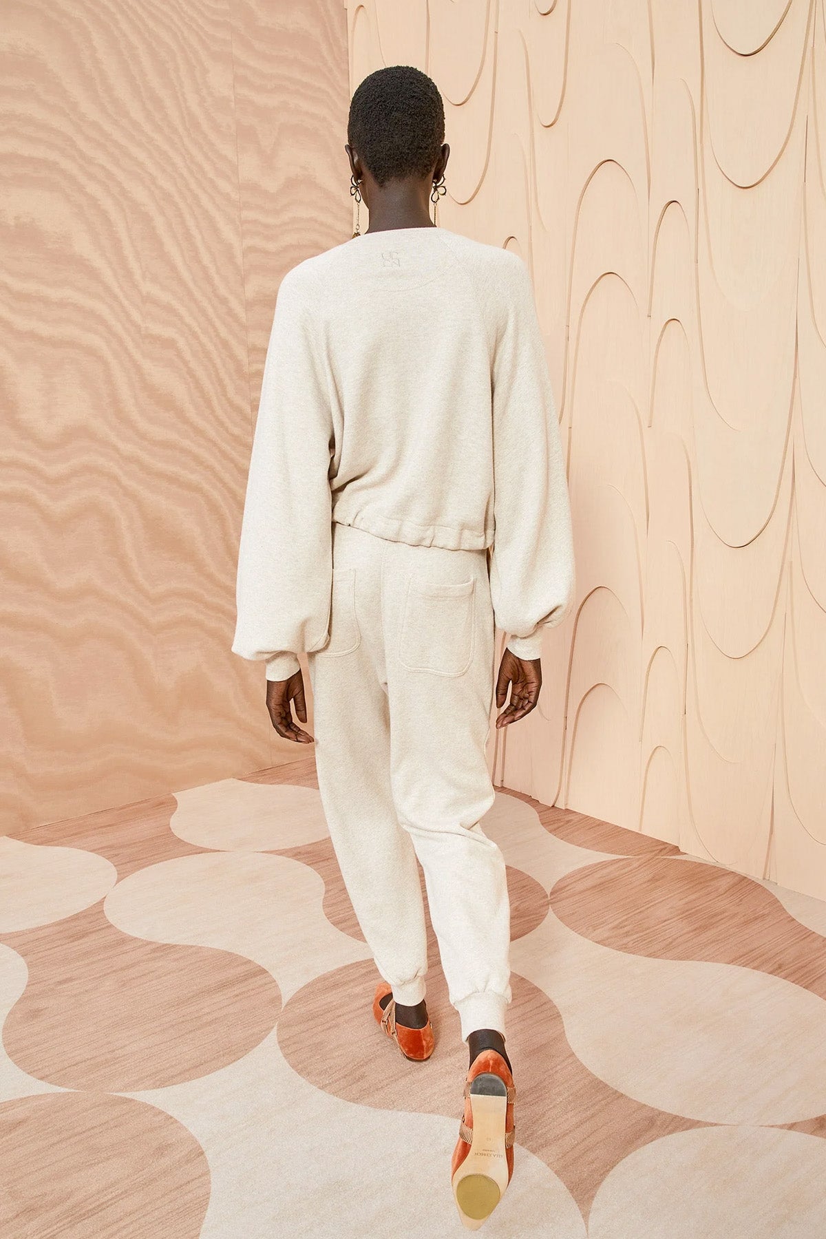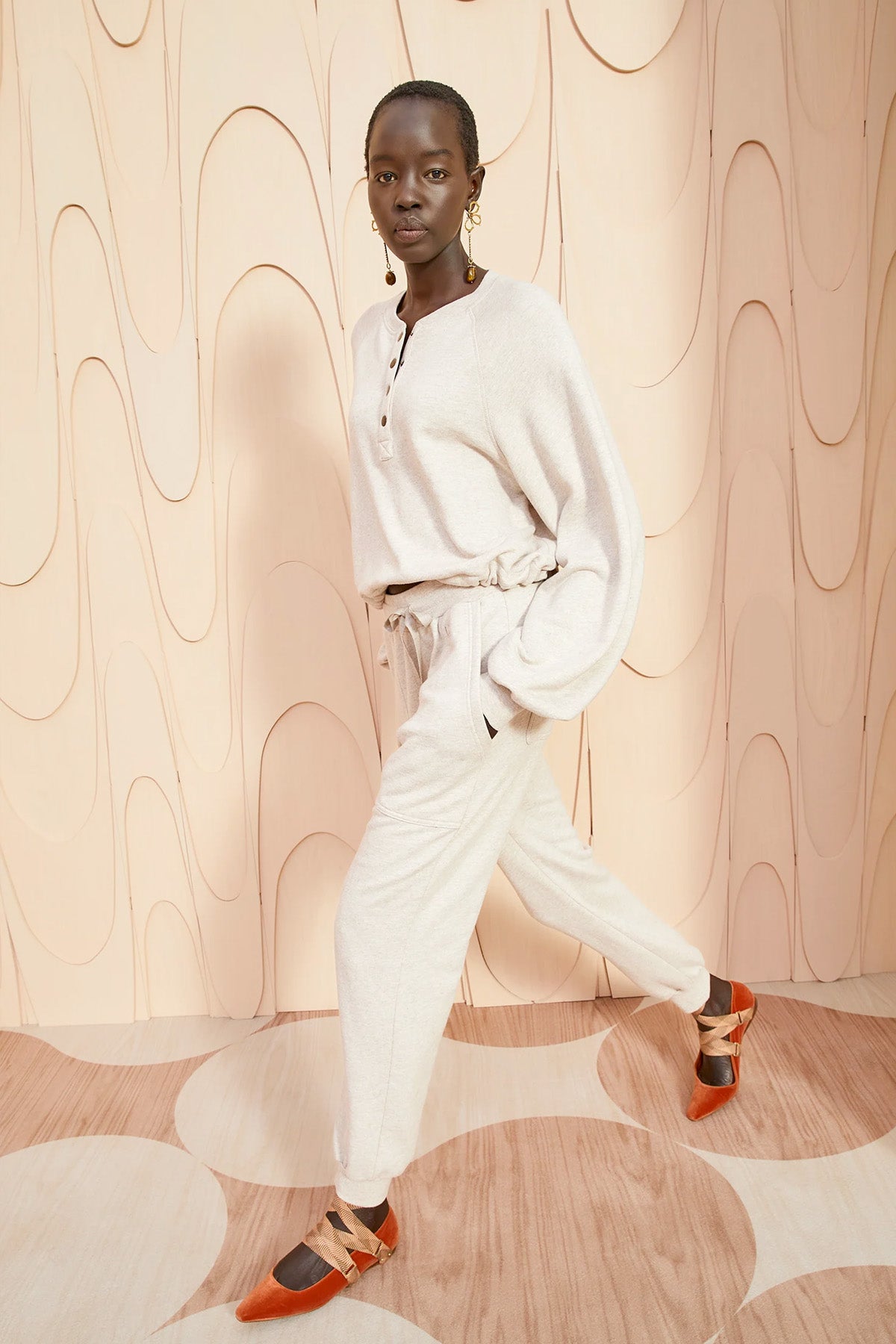 The Rory Pant is made from our ultra-soft fleece, a luxurious blend of bamboo and organic cotton. These pants in a neutral cream hue feature a drawstring waist, front and back patch pockets, and ribbed cuffs for elegant definition .