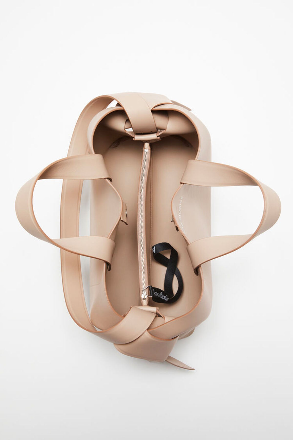 Midi tote bag is adorned with twisted musubi knots on each side, inspired by traditional Japanese obi sashes. Crafted from soft leather, detailed with an embossed Acne Studios logo. Completed with a middle zippered pocket compartment and a discrete magnetic closure.