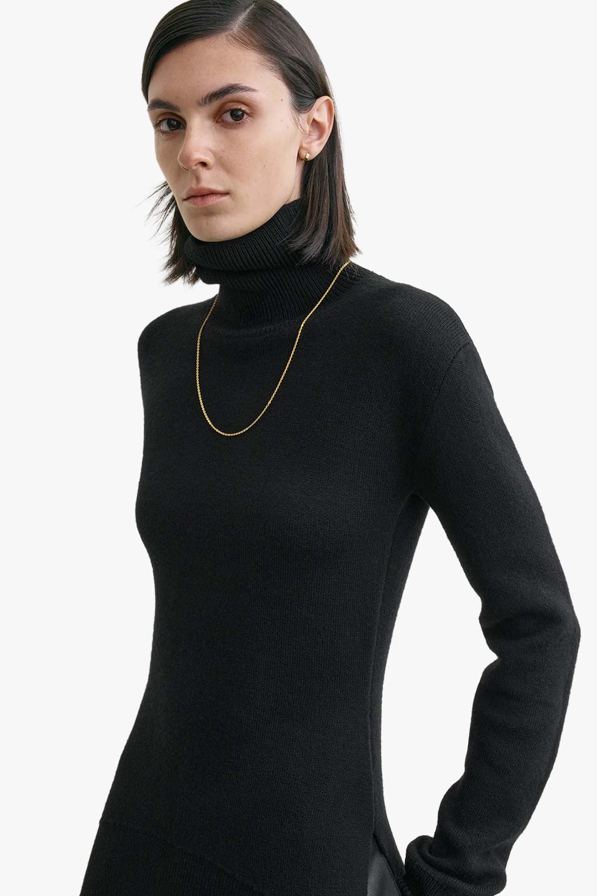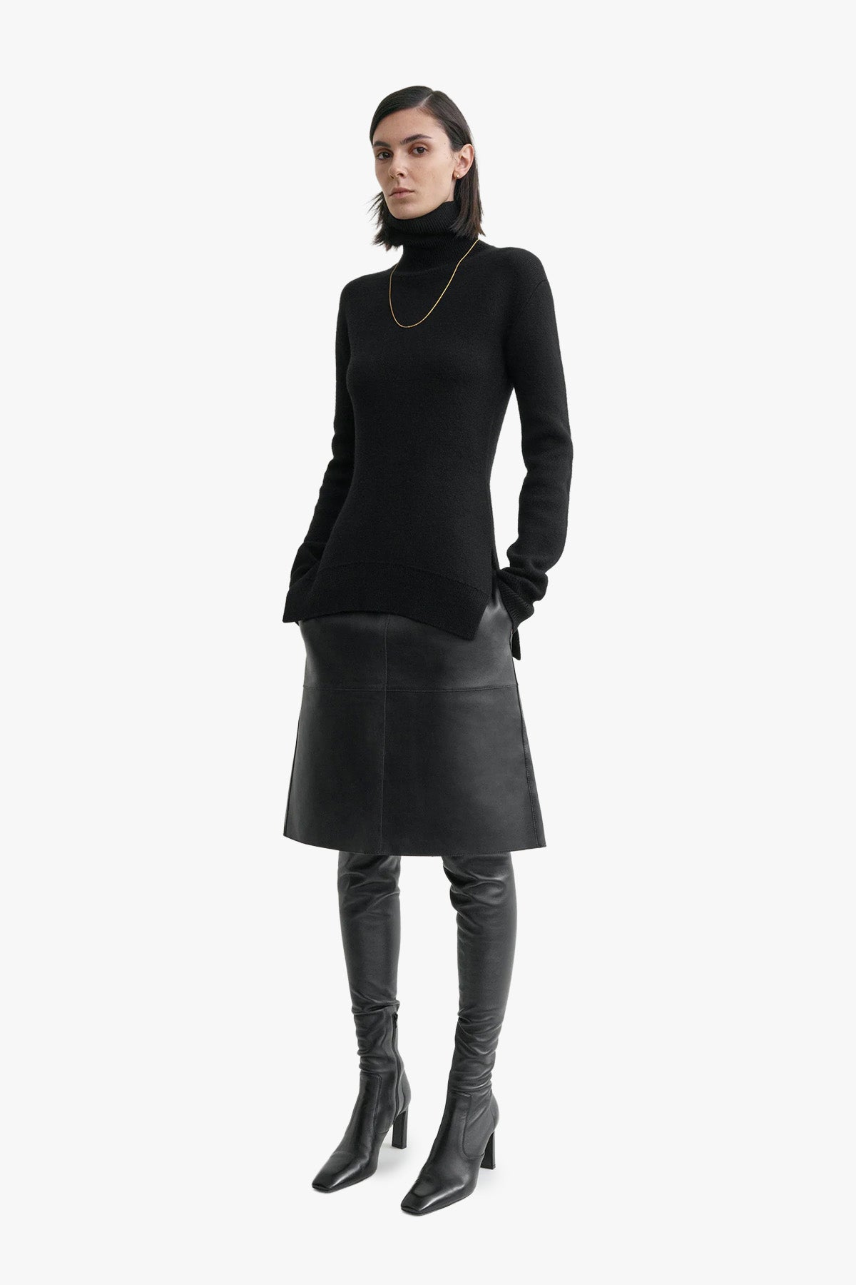 Sweater with a subtle hourglass silhouette and a long, curved hemline to make a sculptural impression. It is double-knitted from a warm cashmere blend finished with a high neck and ribbed edges. Balance the slim figure with an A-line skirt.