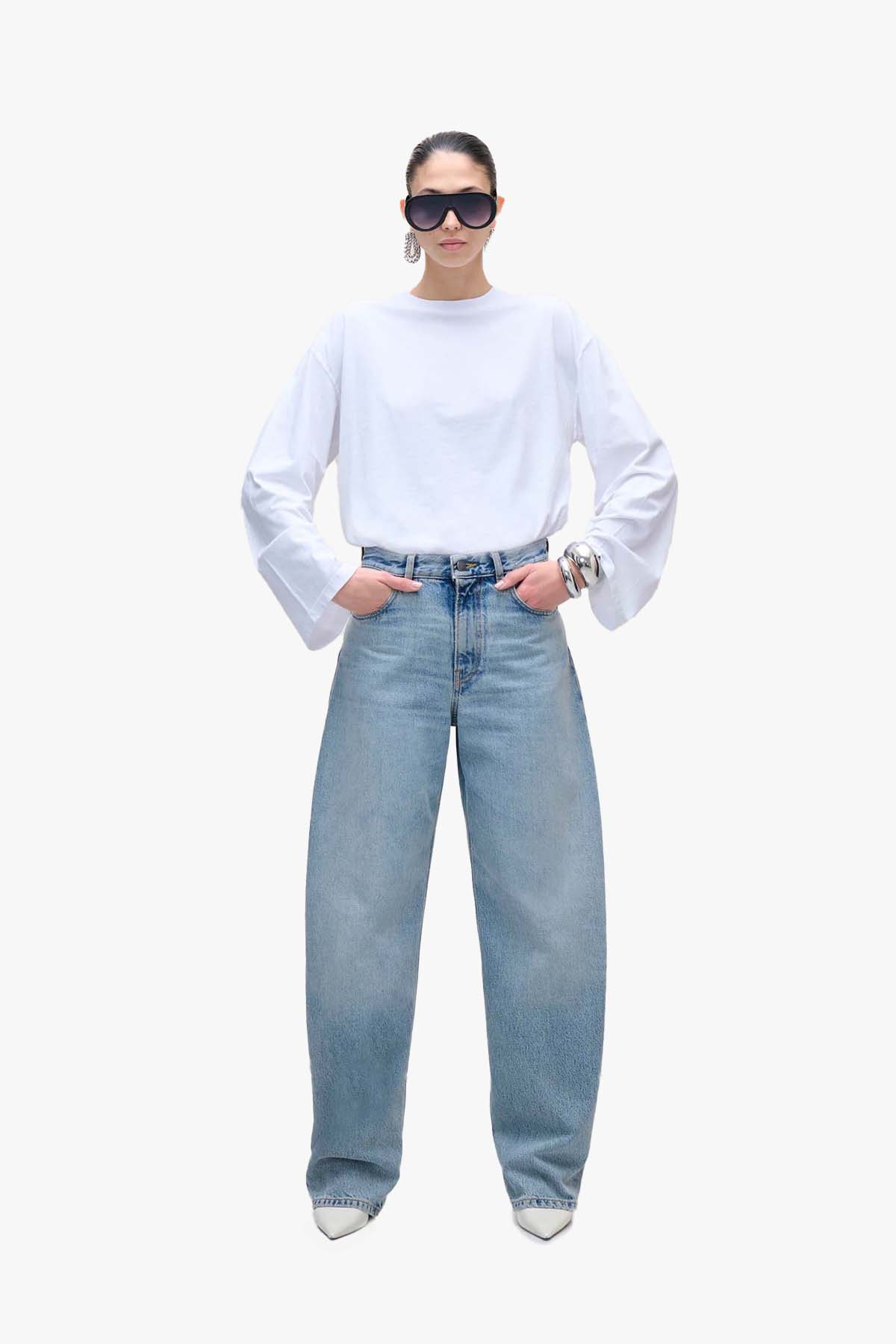 Denim trousers with a balloon silhouette, offering a sculpted volume throught the leg and refined, tapered finish
