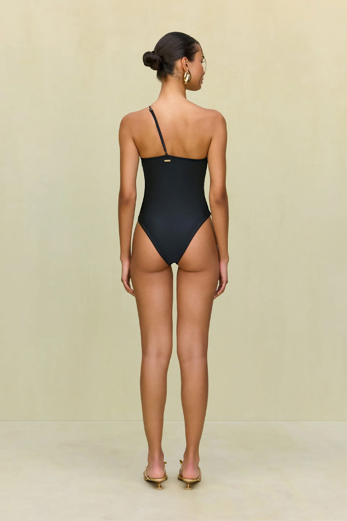 An asymmetrical one piece featuring flattering cutouts and an abstract gold-toned hardware detail at the front. The shimmer tricot fabric and double lining offer a sleek silhouette, while the artistic design adds a bold, statement-making touch to your swimwear collection.