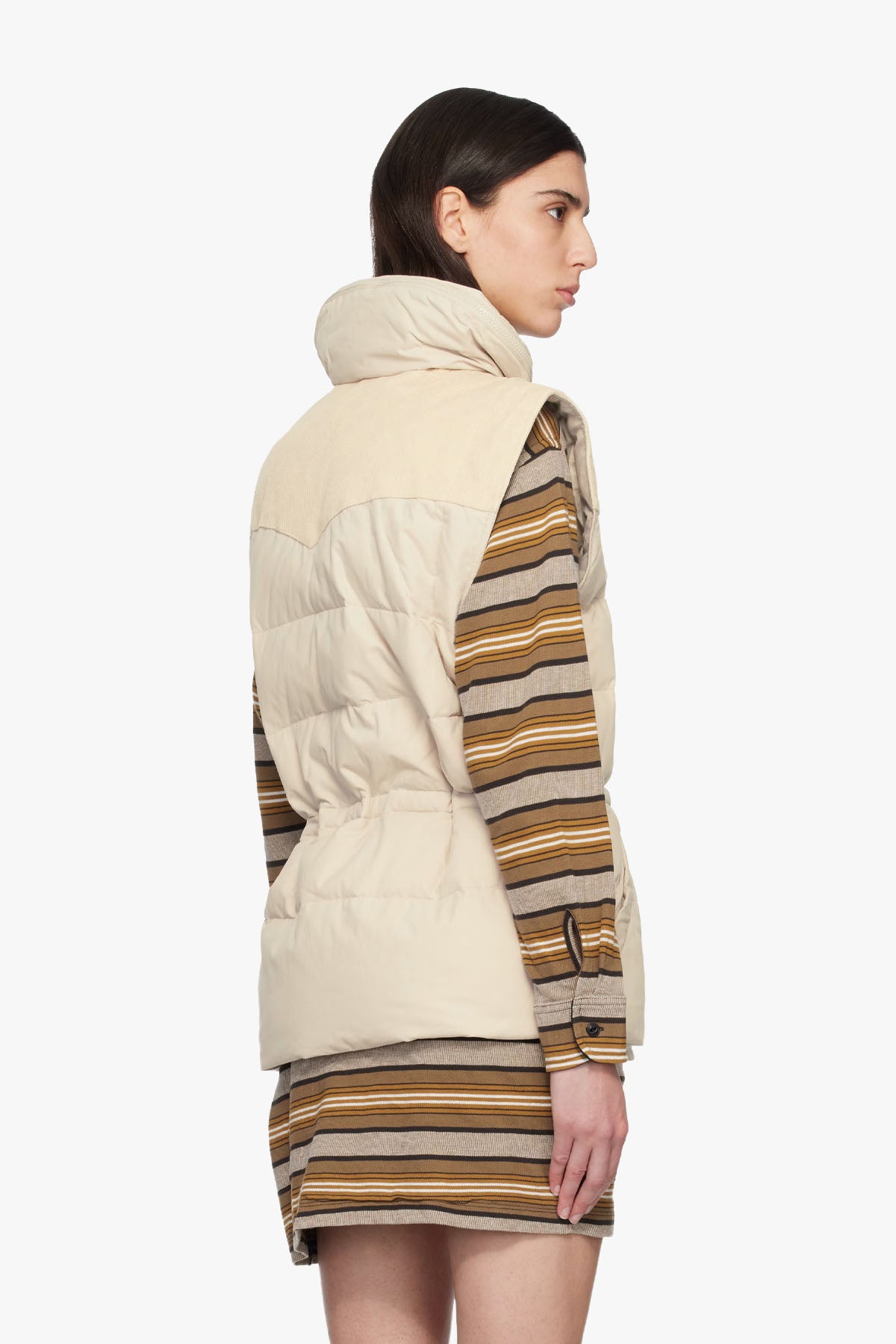 En quiltet vest som kombinerer Isabel Marant Étoiles karakteristiske uanstrengte silhuett med praktiske detaljer for lag-på-lag gjennom sesongen. Cordfløyelspaneler, stowaway-hette og definert midje skaper en moderne, feminin balanse mellom chic hverdagsbruk og subtil funksjonalitet.