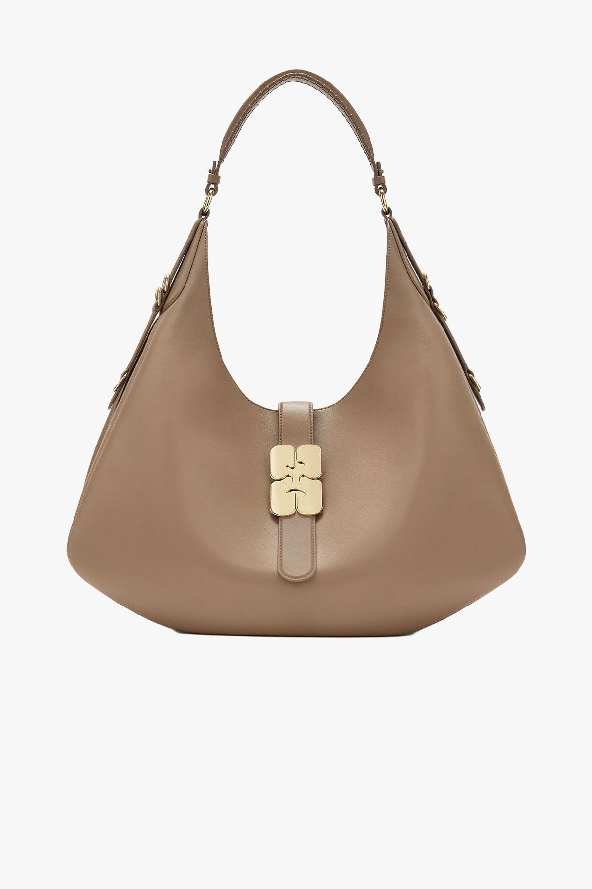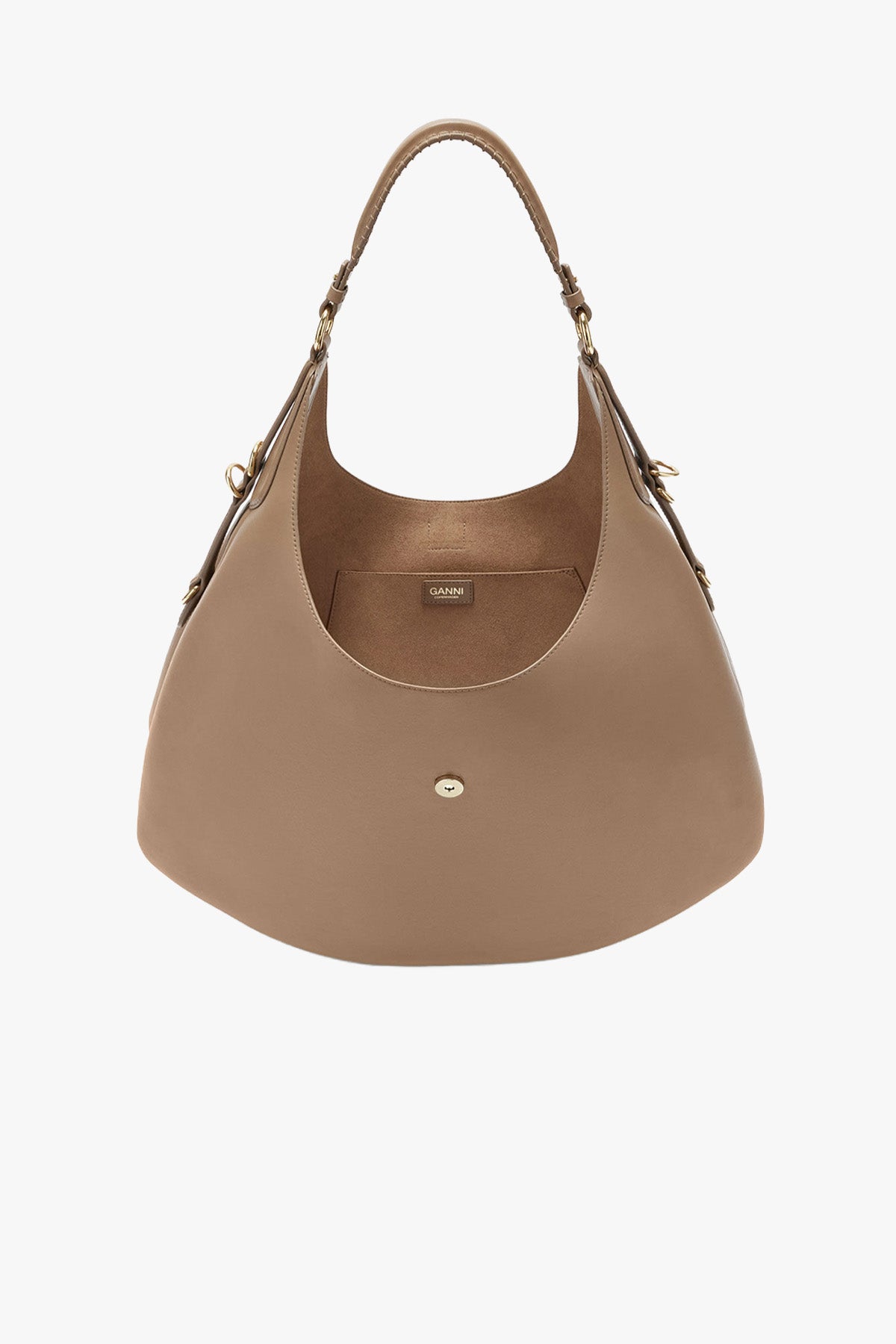 En romslig og moderne skulderveske med en karakteristisk soufflet-aktig silhuett. Designet kombinerer funksjon og signaturdetaljer, med GANNI «Butterfly»-spenne og praktisk innside som gjør vesken ideell til både hverdag, jobb og reise.