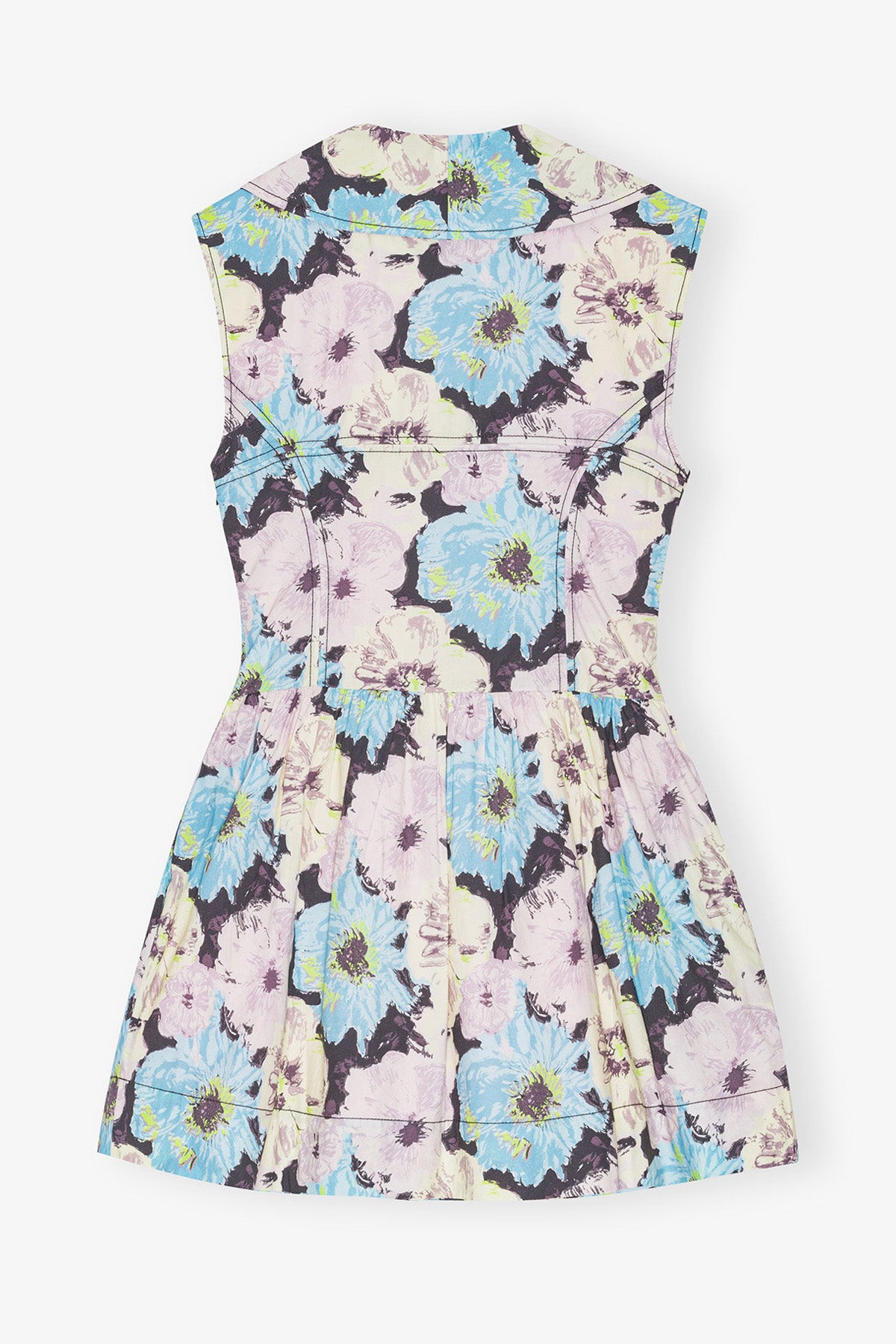 This Floral Printed Cotton Mini Dress is sleeveless and features a large collar, front zip closure, a flared skirt with a ruffle detail.