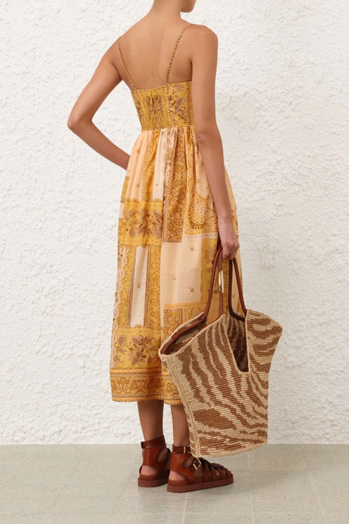 The Lucky Corset Mini Dress in Mustard Bandana is a playful yet structured piece from Zimmermann's Summer Swim 2025 Collection. Cut from crisp cotton, it features a flattering corset-style bodice with underwire support, boning through the waist, and a shirred back for ease. Side seam pockets and adjustable straps add function to this flirty silhouette.