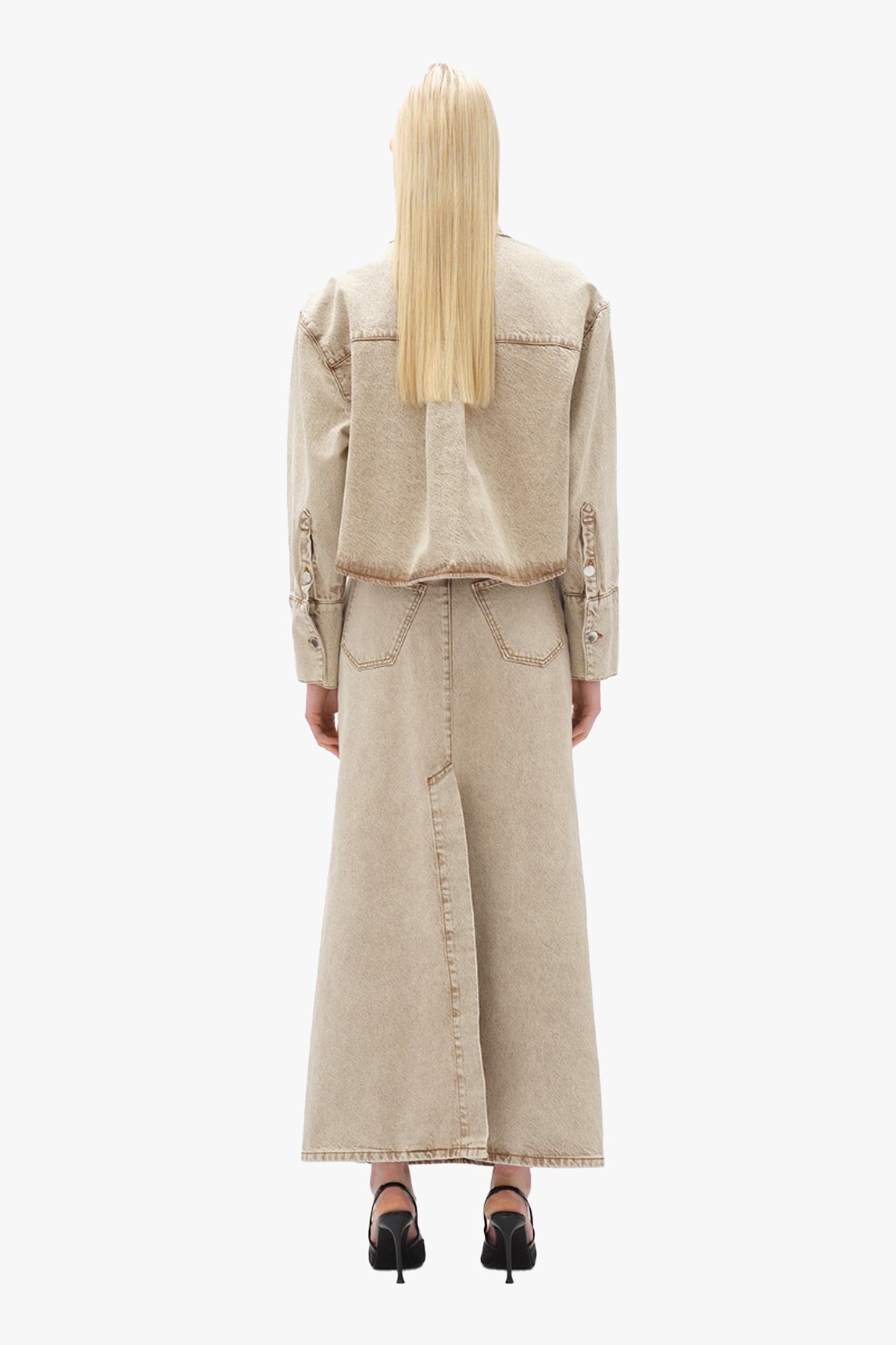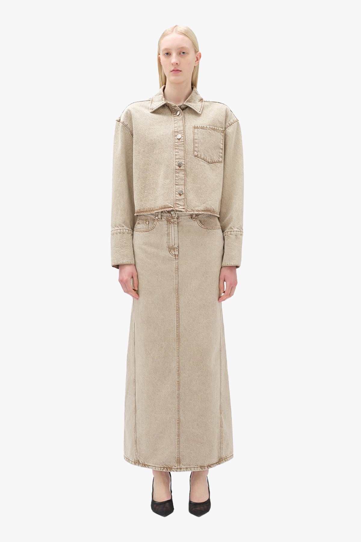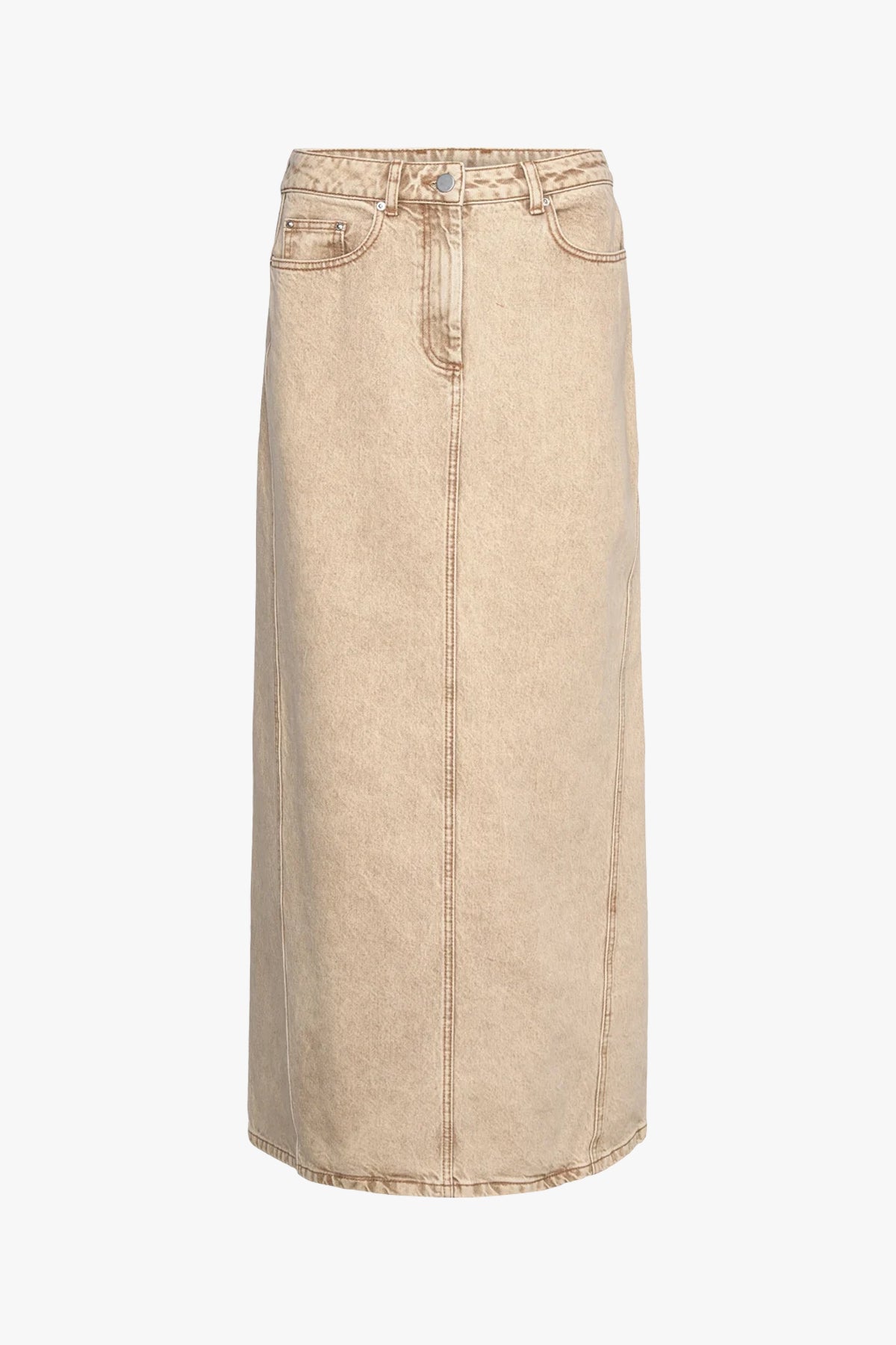 Embrace denim perfection with this maxi length denim skirt. This 100% organic cotton skirt combines a speaking yoke with a back vent for a touch of style and comfort. Elevate your denim game with this chic maxi length skirt.