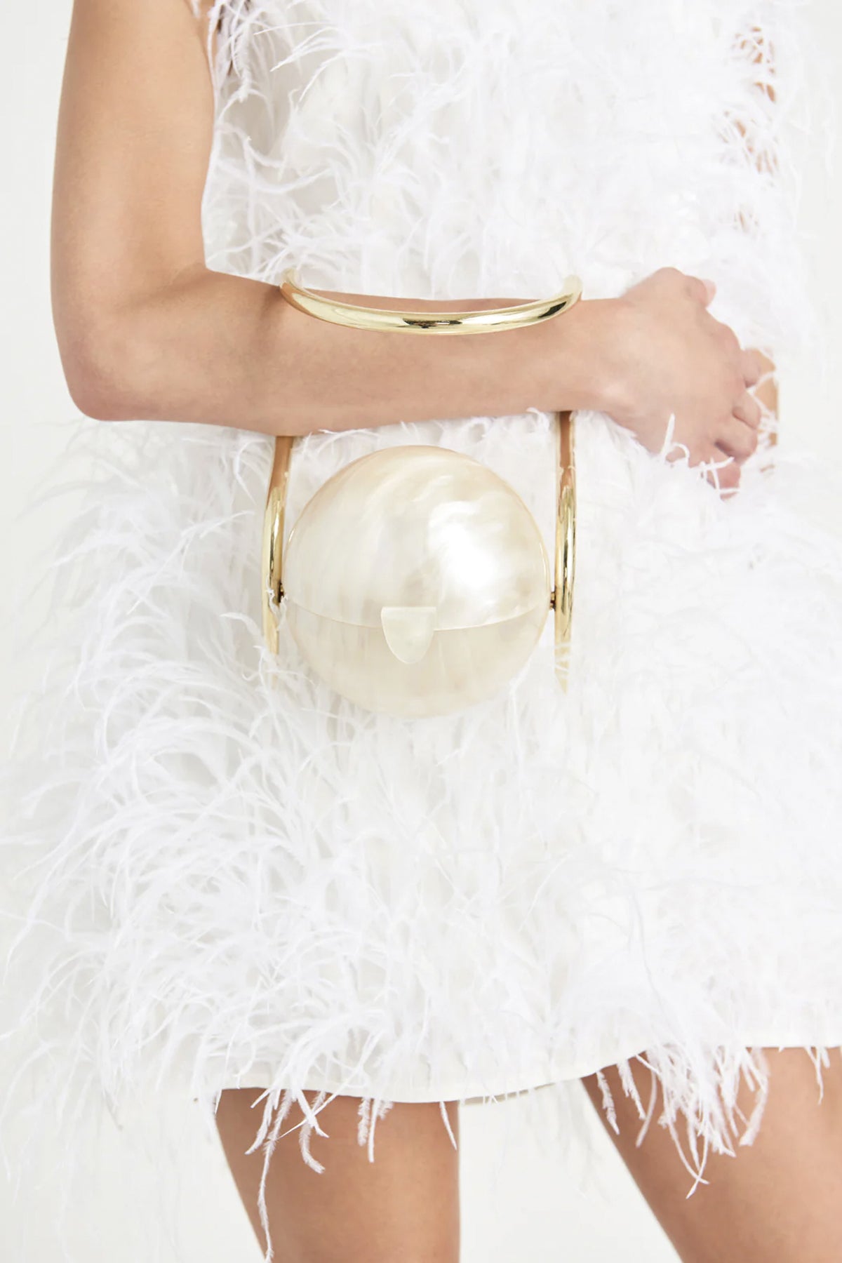 The Pearl Bag is a true Objet d'Art. This bag has a clasp open top, featuring a gold oblong handle. Wear this on your arm like a bracelet, or hold by hand.