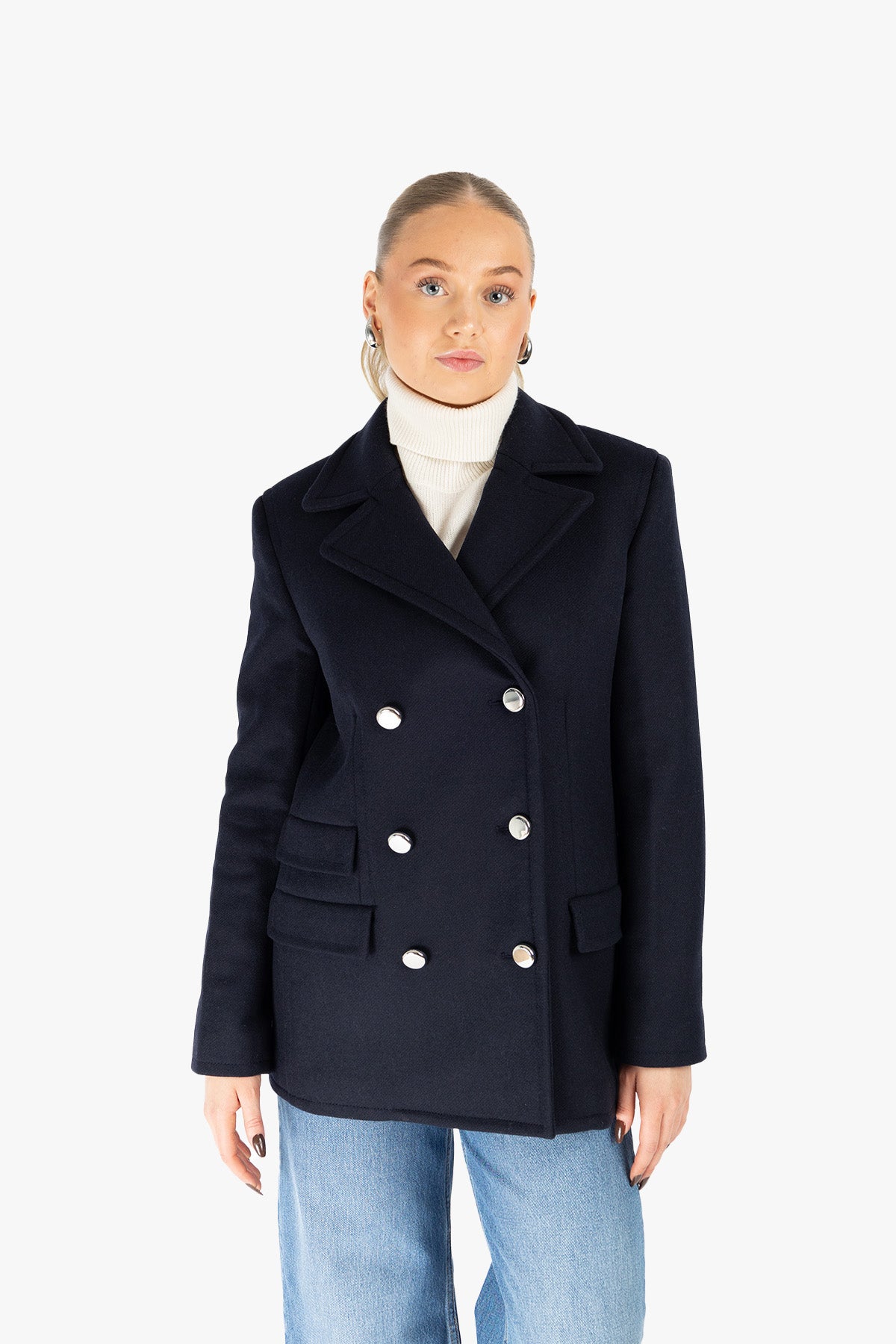 Exquisitely fusing classic tailoring while offering a masculine-inspired, tailored look, this relaxed blazer features wide lapels, structured shoulders and double-breasted peacoat front. This timeless style is crafted in responsibly sourced recycled wool-blend Melton.