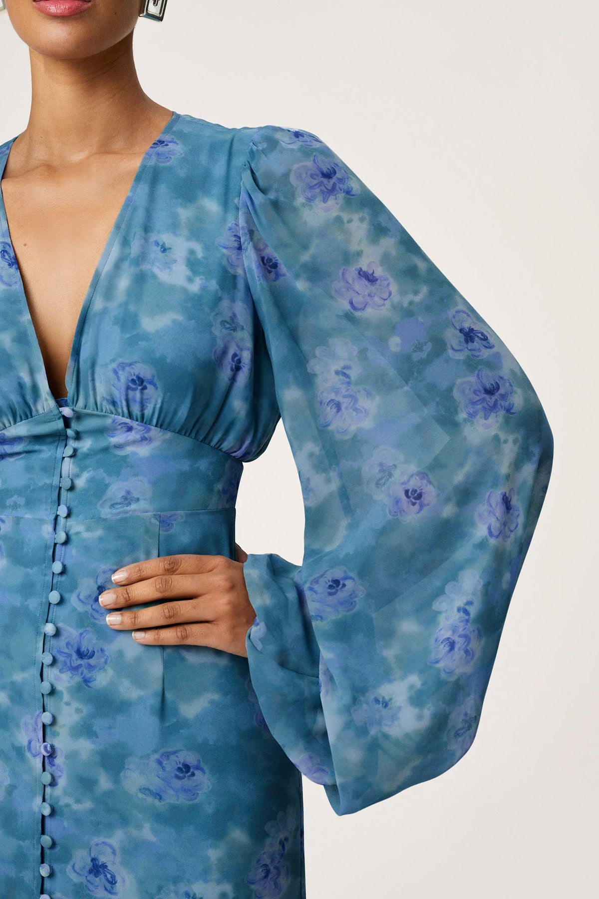 Positano dress in a blue floral print. The dress has a V-shaped neckline, buttons along the front and a front bottom slit. It is fully lined in the body, has full length sleeves and a hidden zipper at the back.