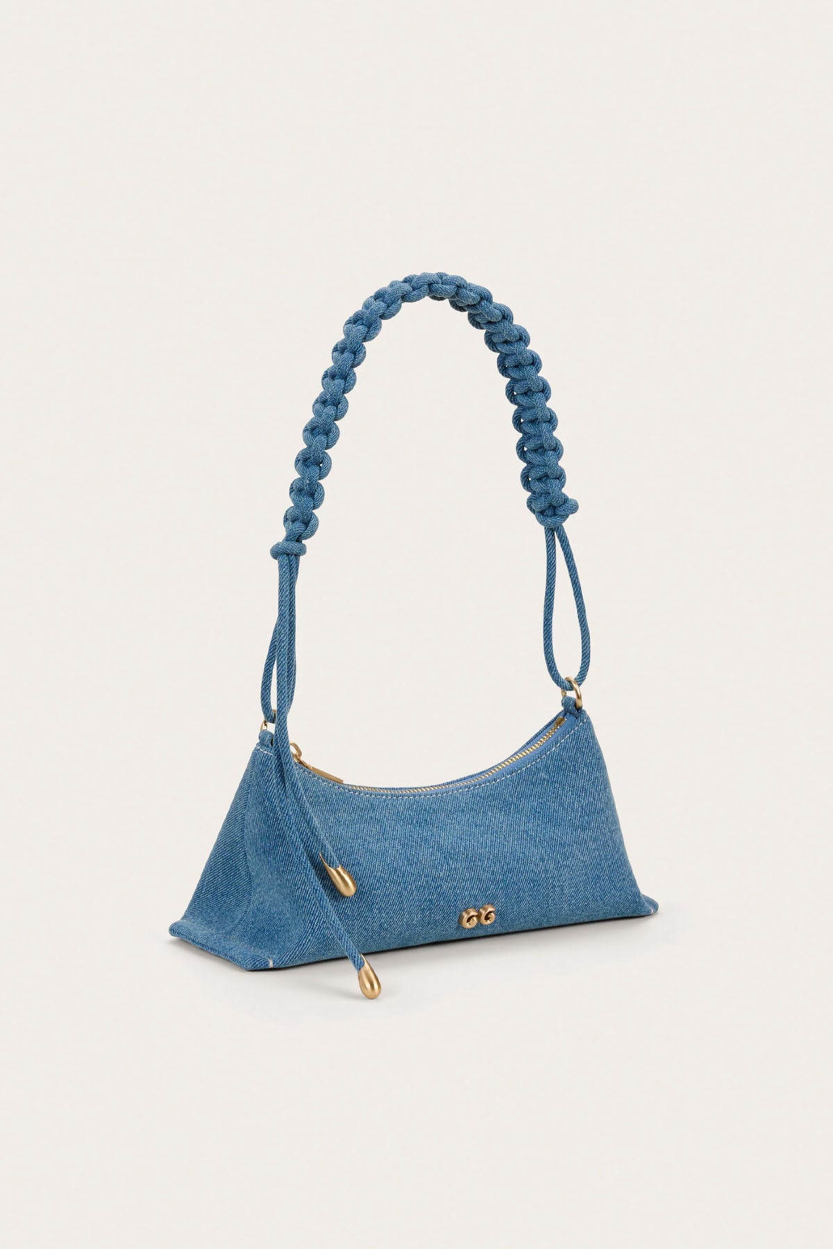 The Osa Shoulder Bag is crafted from soft stretch denim and elevated with gold-toned hardware and a unique woven strap. With its sleek silhouette and zipper closure, it's the perfect balance of effortlessness and style.