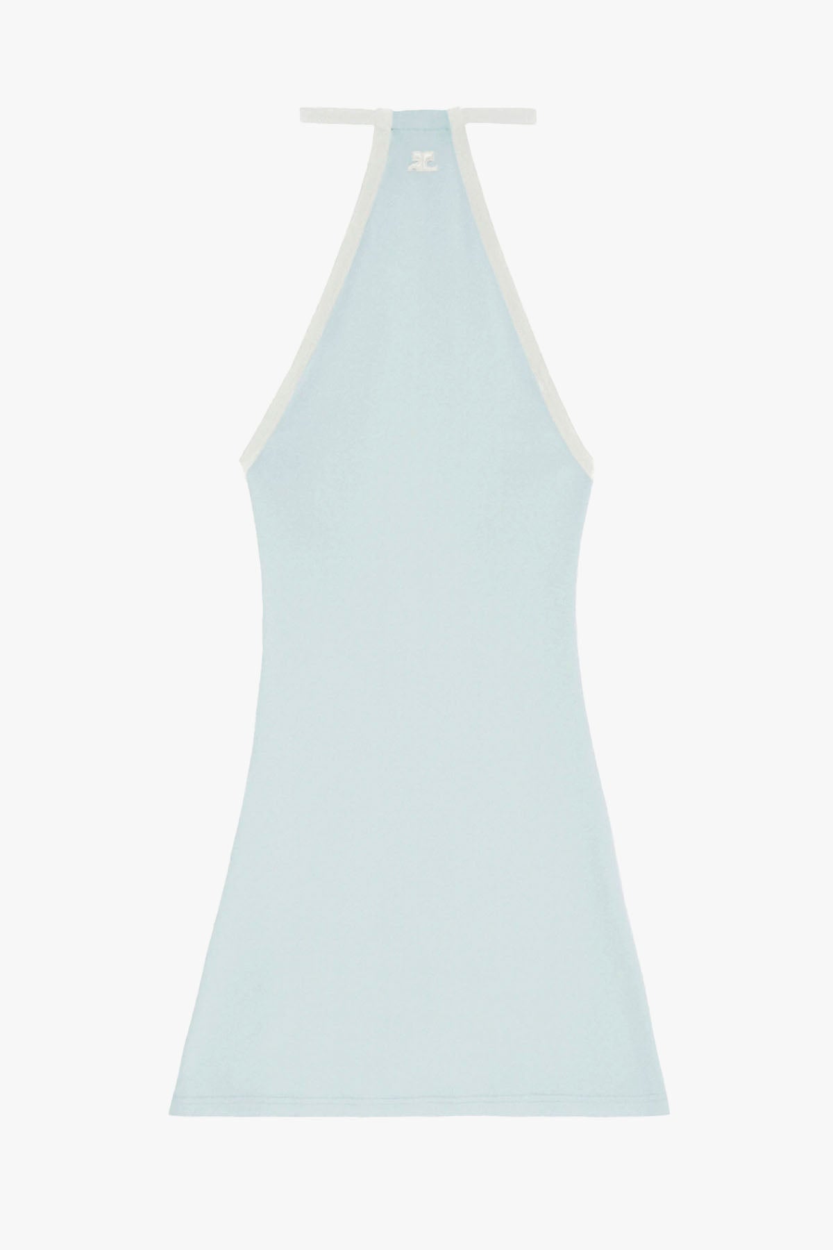Short jersey dress with choker neckline, embroidered logo and contrasting bias.