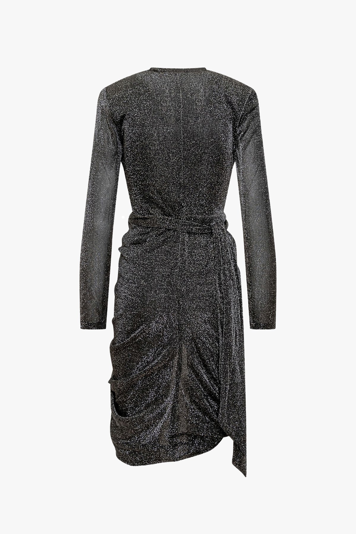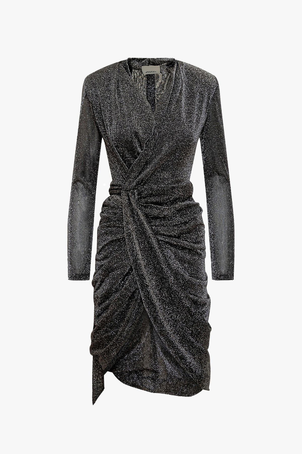 The Cleora Dress by Isabel Marant is a dazzling statement piece that blends elegance with modern allure. This dress features a wrap-effect bodice that cinches the waist beautifully, complemented by ruched detailing for added texture and sophistication. Its draped silhouette and long sleeves create a balanced and refined look, making it perfect for evening events or festive occasions. Pair it with strappy heels and subtle jewelry for an effortlessly glamorous look.