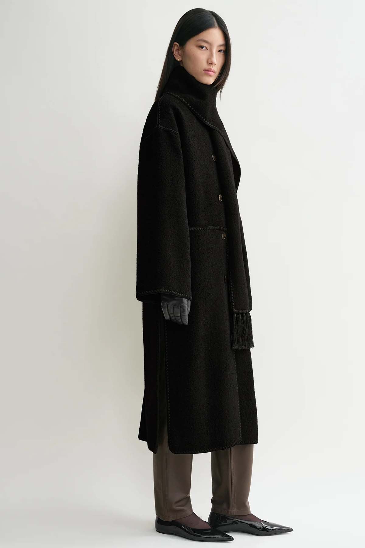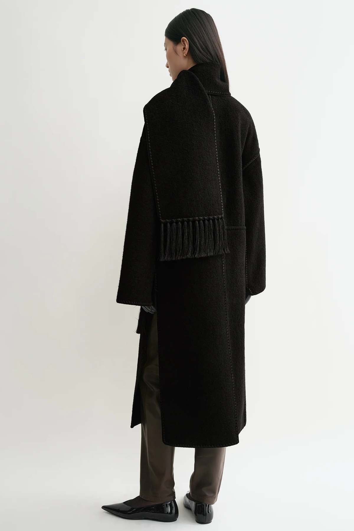 TOTEME Embroidered scarf jacket reworked into an oversized coat with an attached scarf that wraps elegantly around the neck. It is made from a heavyweight wool blend with artisanal blanket stitching and lustrous tassels, then complete with spacious pockets and a buttoned front. Wear it when out and about in the city.
