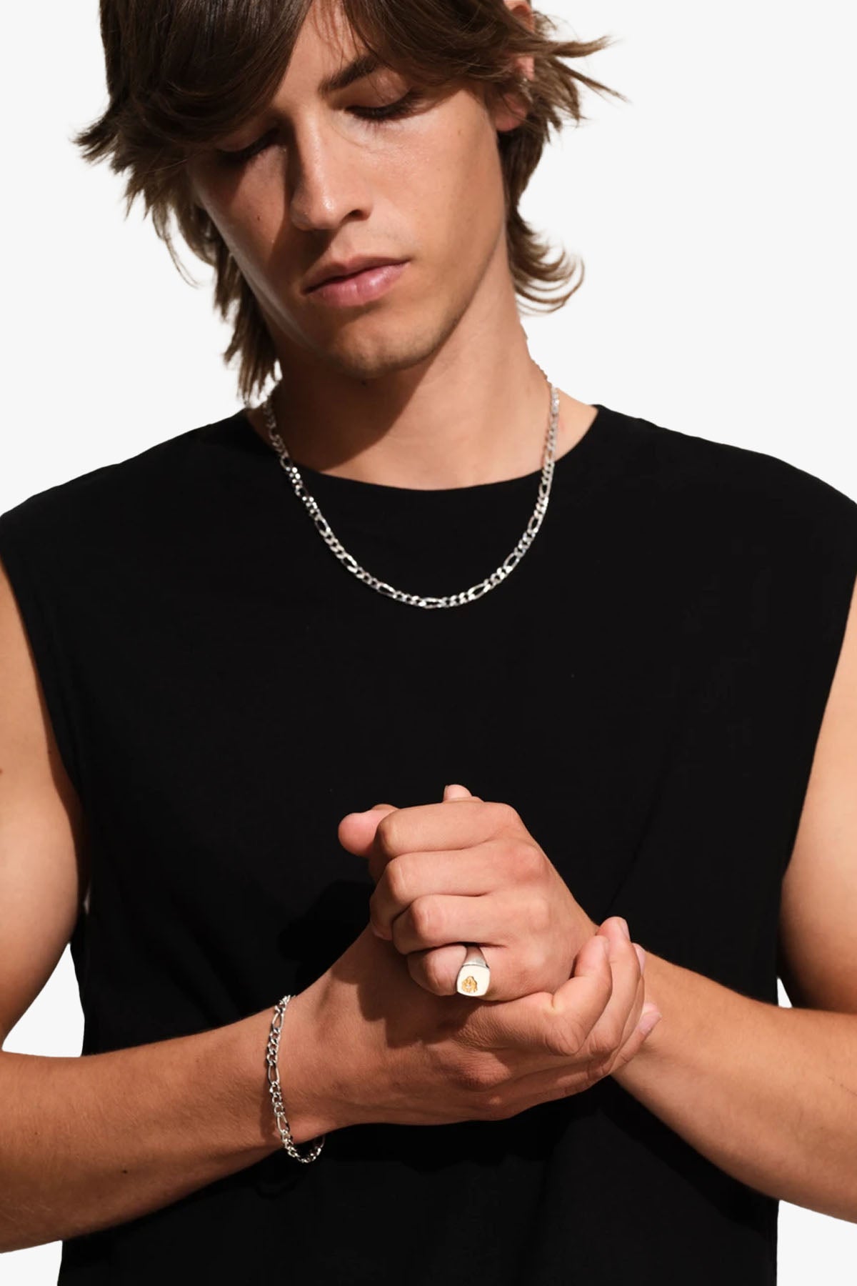 The Bo Chain Thick holds the timeless structure of a figaro chain. Small round and elongated oval curb shapes are joined together, and locks with our custom designed mechanism.