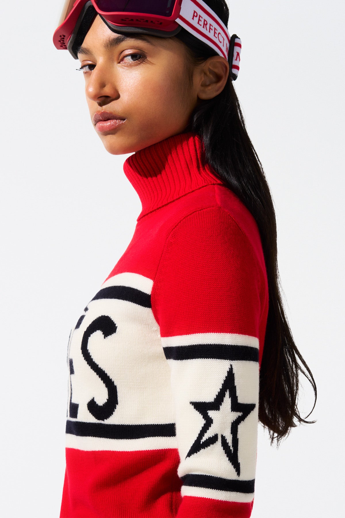 An update to our best-selling Schild Sweater. Crafted from cozy Merino wool, it’s a warm, reliable companion for a day on the slopes. Its signature "Après" intarsia design also makes it the ideal transitional layer for an evening of après-ski. This style runs true to size and is intended to be fitted. We recommend pairing with any of our Aurora pants for the perfect ski look.