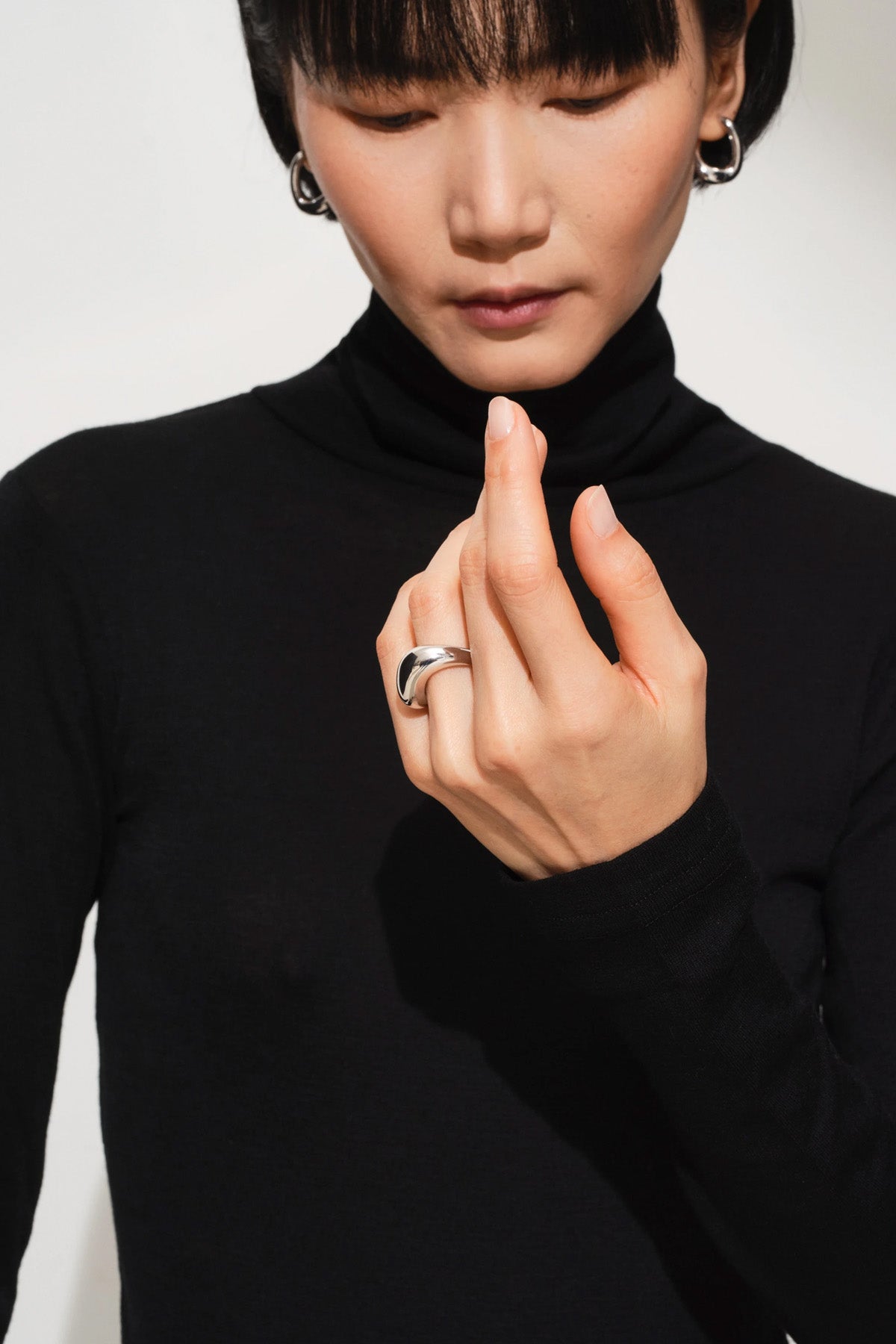 A twisted band ring, made with 925 sterling silver in a polished white rhodium plating. All metals are 100% recycled.