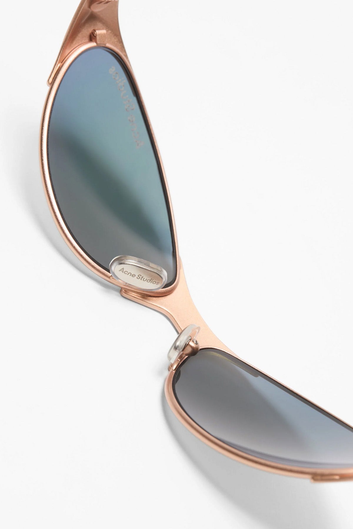 These sunglasses feature a sleek oval shield silhouette, highlighted by silver-toned steel frames and a heart charm with the Acne Studios logo engraved. The perfect blend of elegance and modern style, these sunglasses offer both protection and statement-making design.