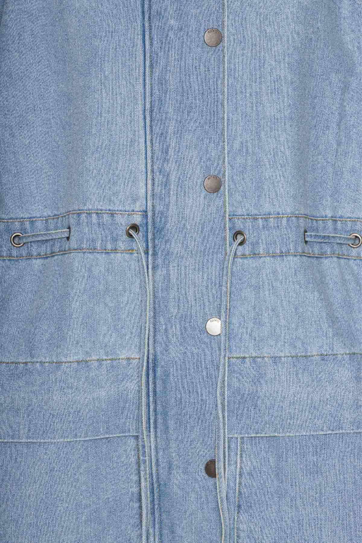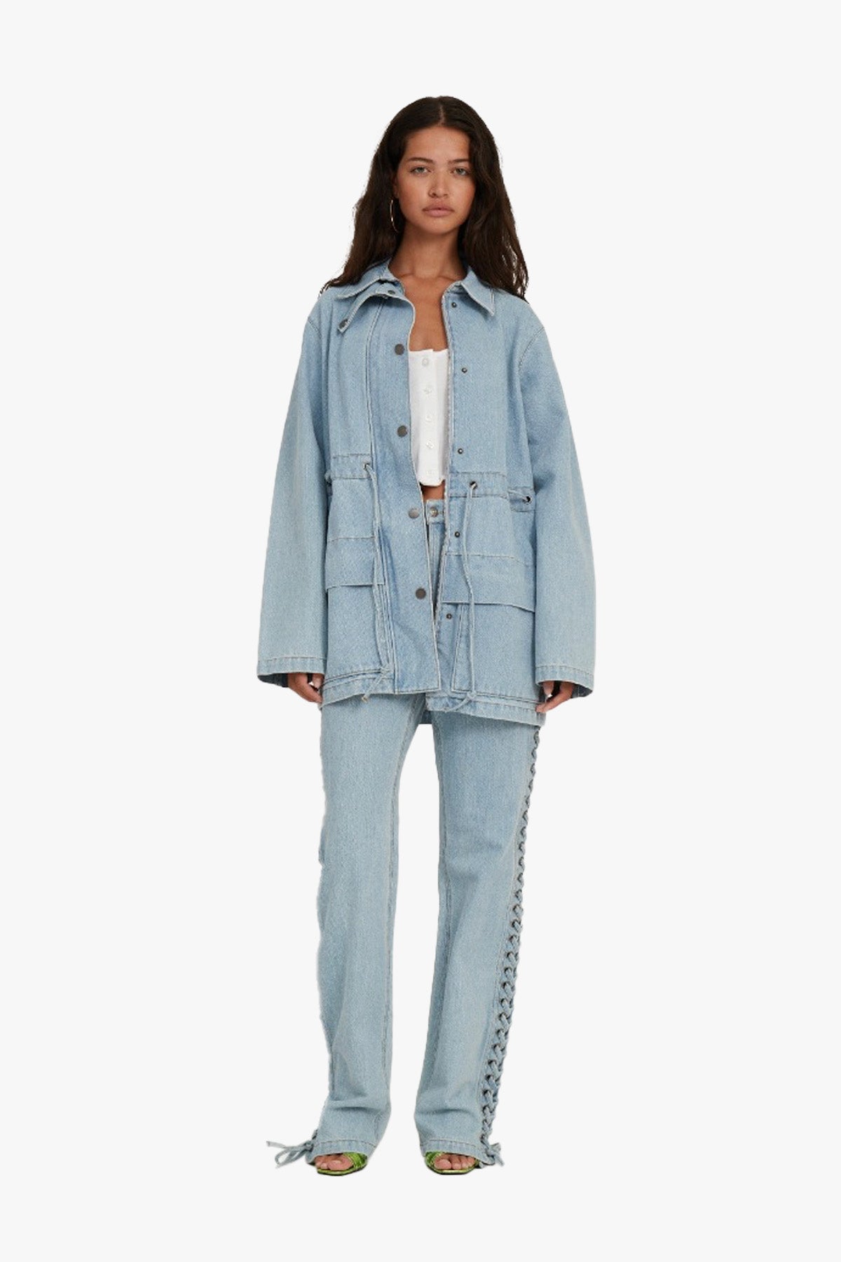 The Laced Denim Jacket features a relaxed fit with adjustable laced details at the waist for a customizable silhouette. It includes a front snap-button closure, a high collar, and multiple spacious pockets. Pair it with the Laced Straight Leg Jeans Blue for a matching set.