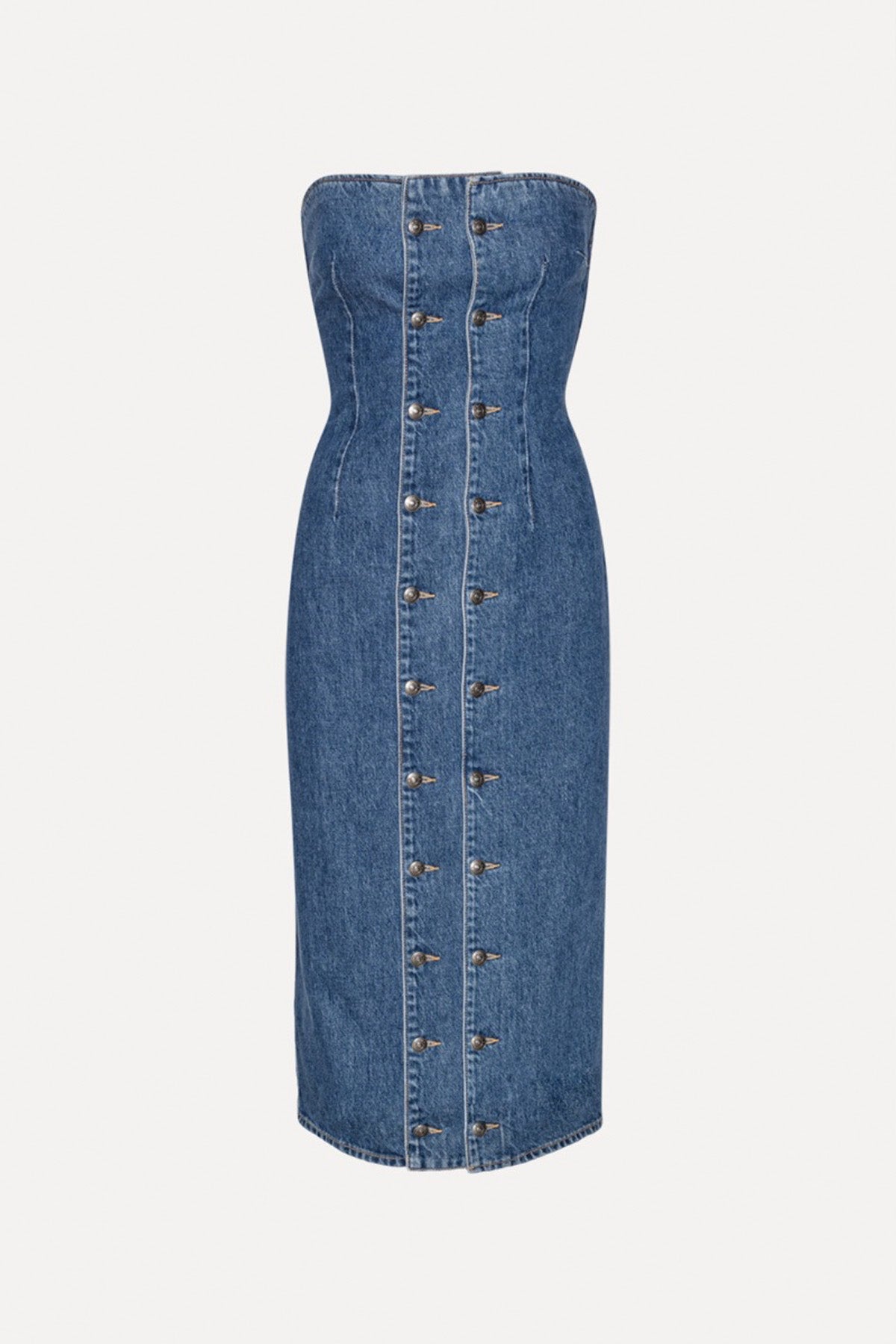 The Denim Button Detail Dress features a strapless design with decorative buttons running down the front for a refined touch. A back zipper ensures easy wear, while a back slit adds movement, blending structured tailoring with modern denim style.