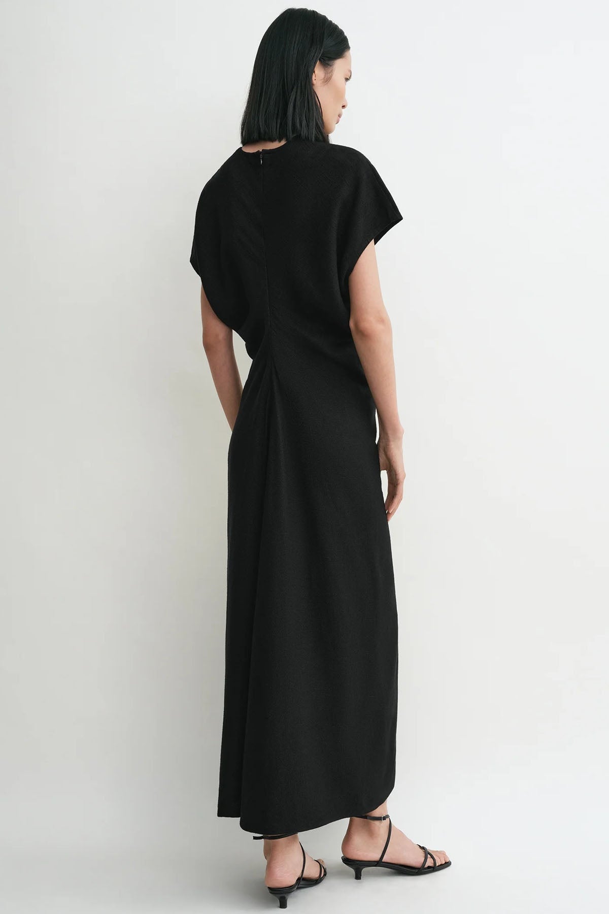 TOTEME dress constructed from curved panels that create a slouching effect at the waist when sewn together. It is woven in a rustic basketweave with cap sleeves and an ankle-grazing hem and fastens with a concealed back zipper. Wear it as a versatile summer piece.