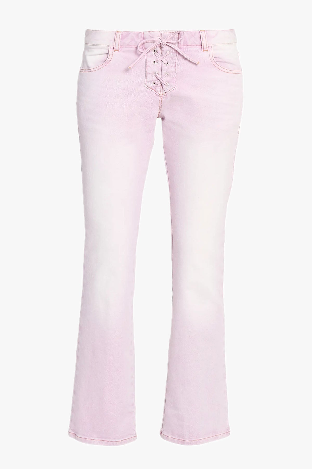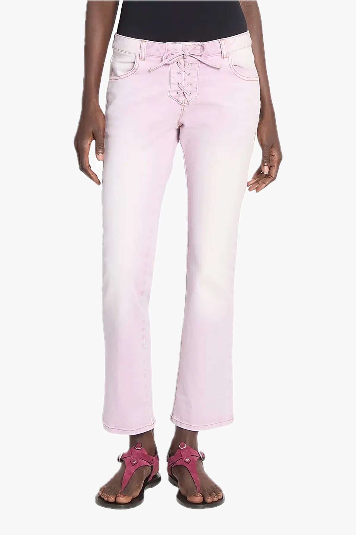 The Vanel Pants by Isabel Marant blend Western-inspired details with everyday sophistication. Crafted from laced stretch denim, they feature a medium-rise waist and a straight, ankle-length cut. Lace-up front detailing and antique gold-finish hardware add distinctive character, while the leather logo patch on the back gives a subtle designer finish.