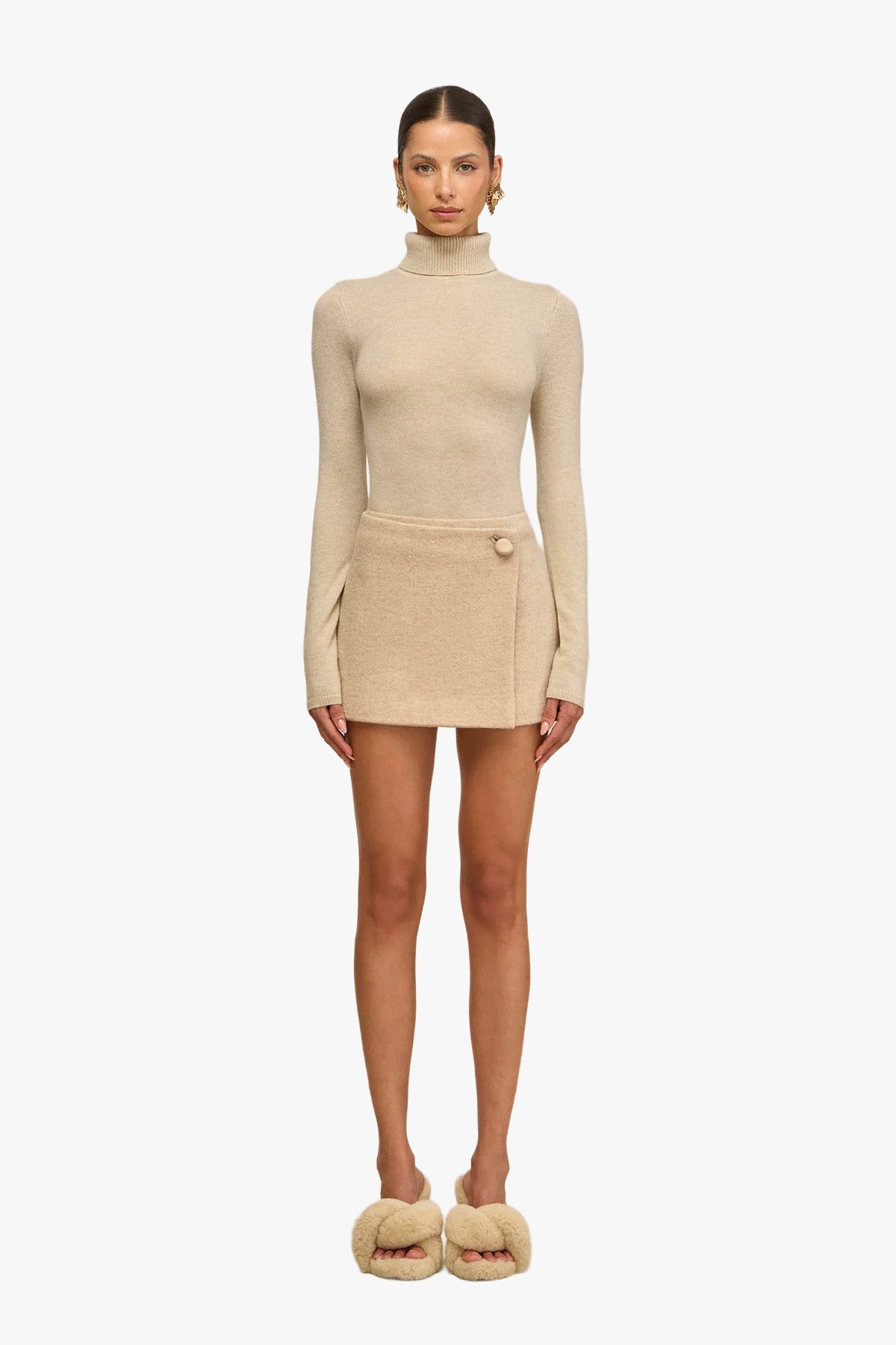 Klassisk mini-skjørt i ull med abstrakt knappelukking i imitert stein.