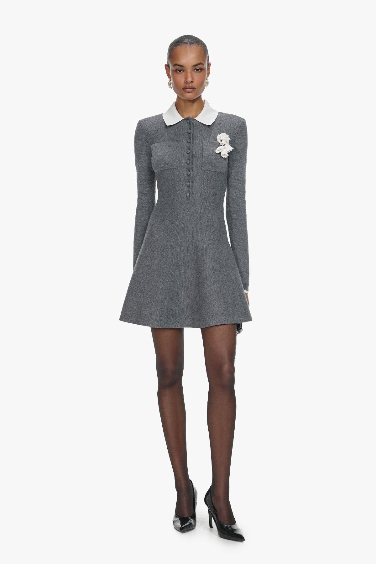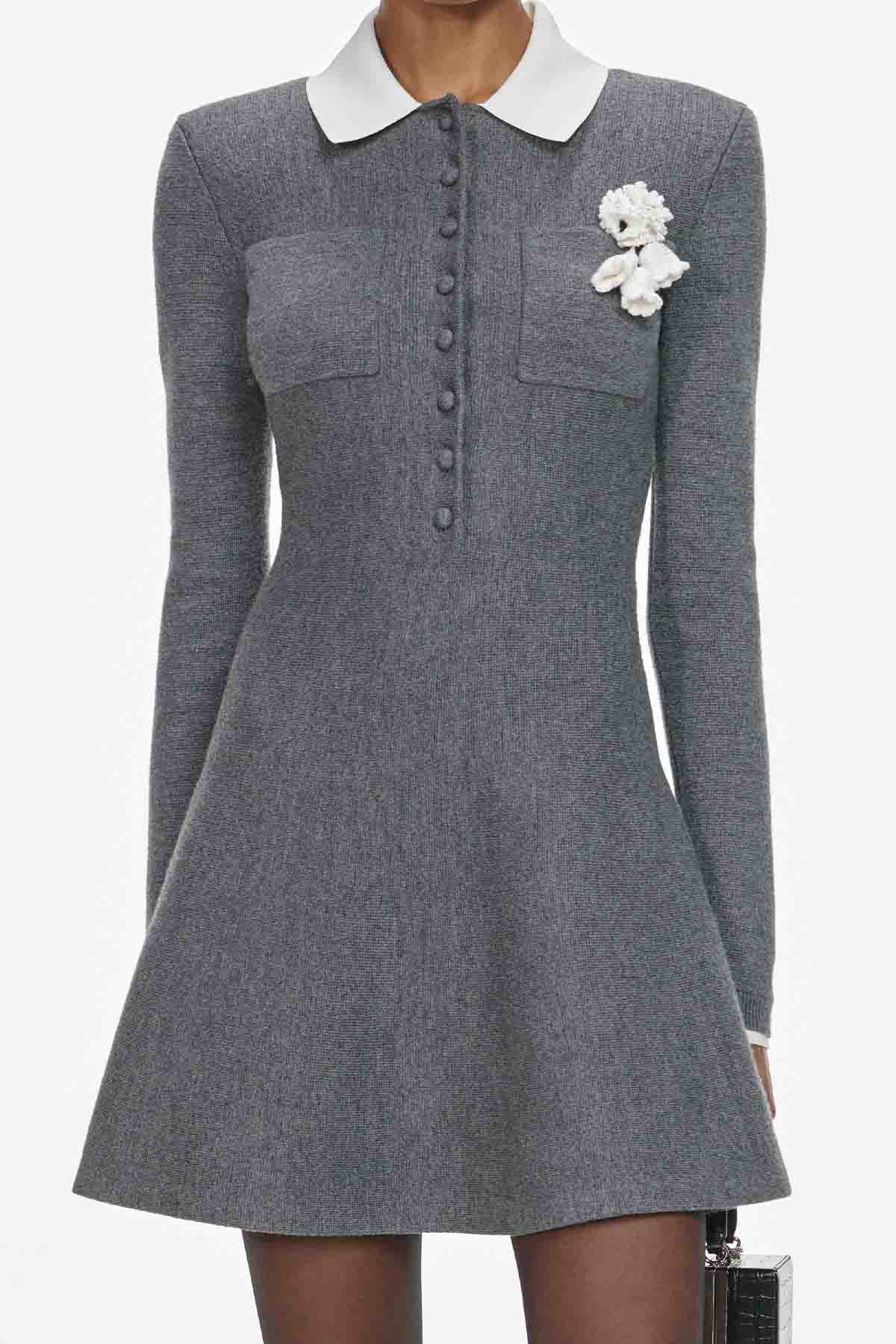 En moderne vri på preppy-stilen – denne grå strikkekjolen har kontrastkrage og mansjetter, samt et heklet blomsterbroderi som tilfører et feminint uttrykk. Den utsvingte minilengden gjør den perfekt til både jobb og kveldsbruk, spesielt stylet med klassiske flats eller støvletter.