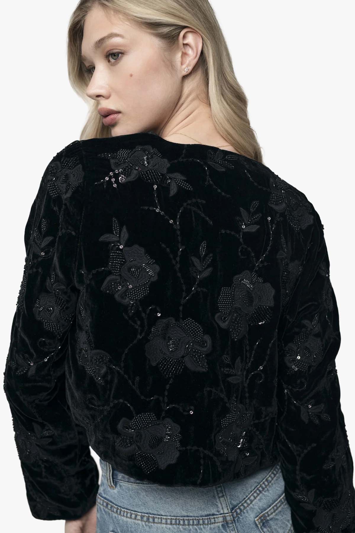 This jacket is adorned with beautiful rose embroidery and delicate beading, creating a luxurious and sophisticated look. It features a straight cut, long sleeves, and closes easily with front hook-and-eye fastenings. Perfect over dresses or paired with jeans for an elevated everyday style.