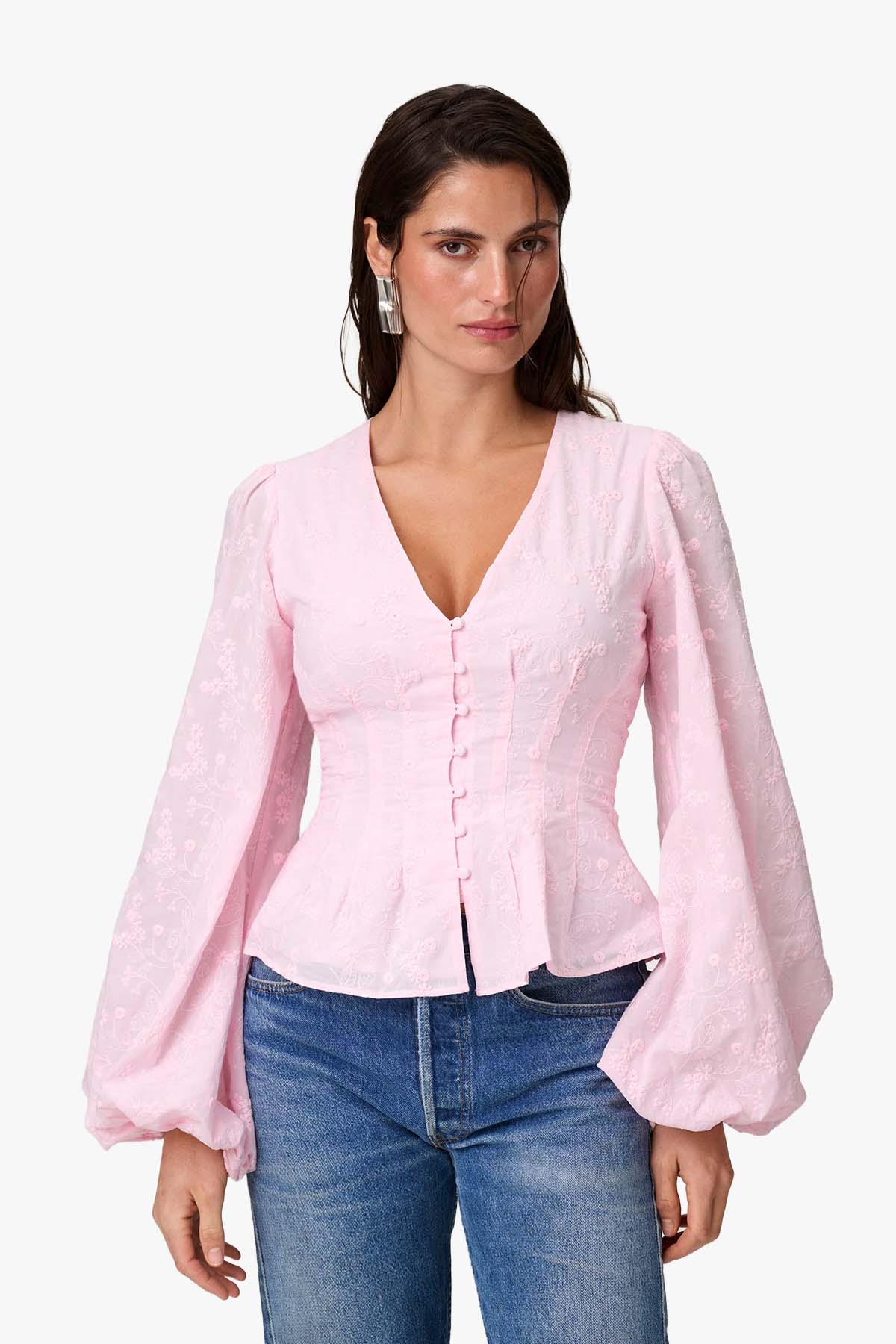 Palena Blouse i pastellgult har en feminin silhuett med markert midje og voluminøse lange ermer. Blusen er detaljert med V-hals, splitter i front og er helfôret for optimal komfort.