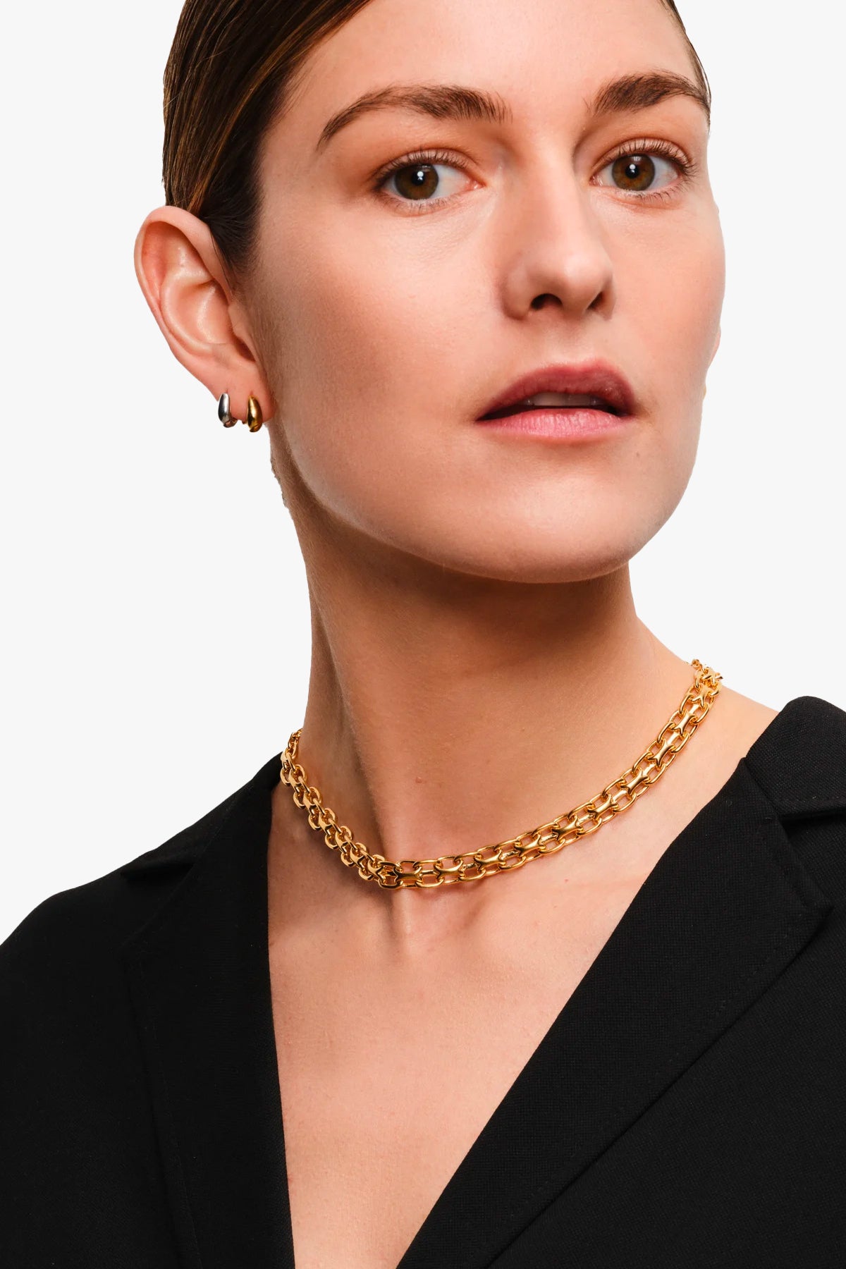 The Ice Huggies Gold are miniature versions of our classic Ice Hoops, designed to wrap the ear tip hence the name. Made in high-quality recycled 925 sterling silver, plated with 9K gold.