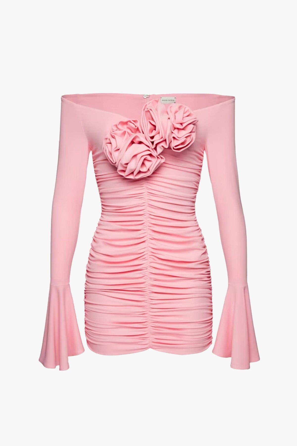 A 70's inspired jersey mini dress with long bell sleeves, all-over ruching, and an off-the-shoulder neckline. A flower brooch at the center features a seasonal bunch of roses.