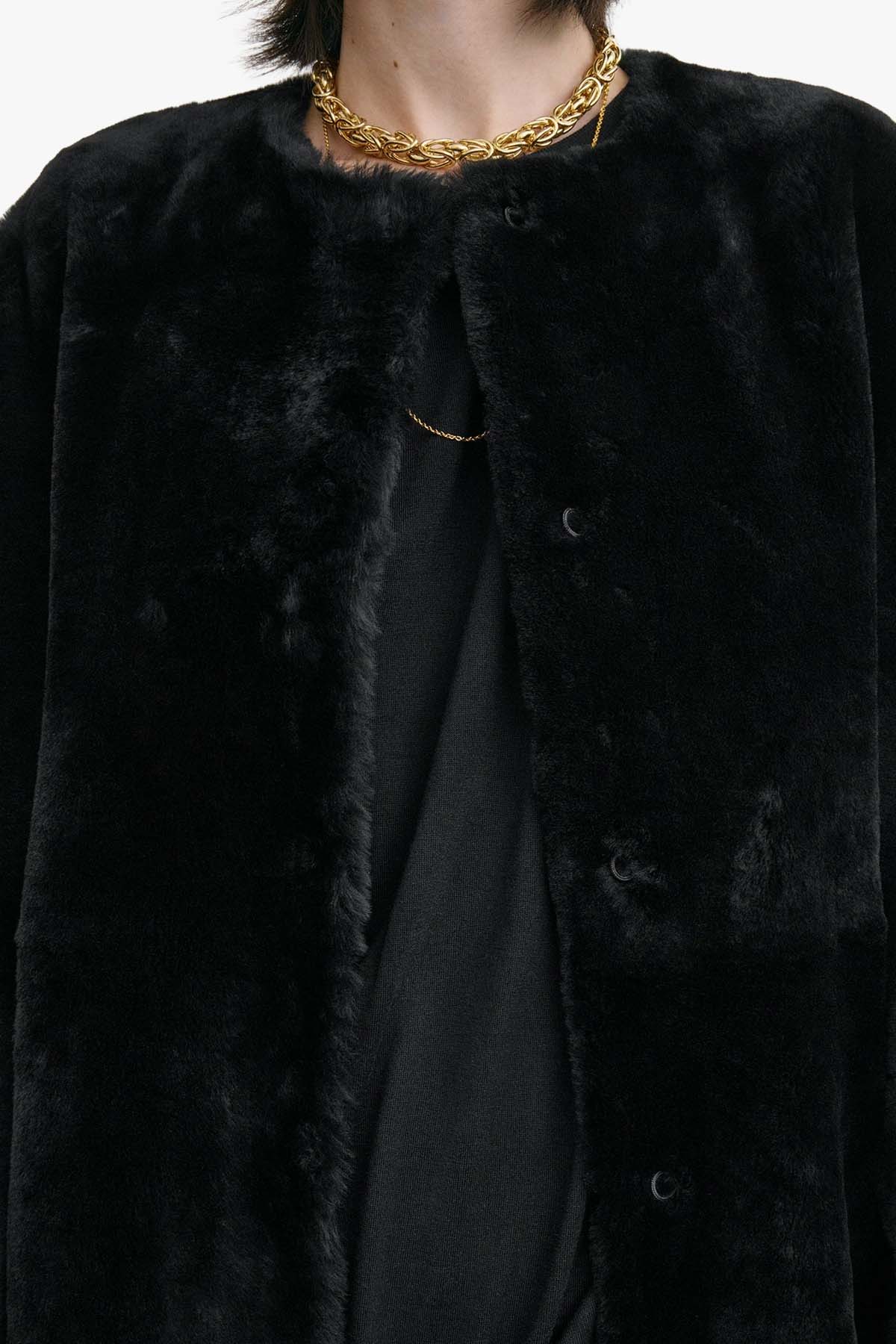 En eksklusiv runway-jakke fra TOTEMEs høst/vinter 2025-kolleksjon, inspirert av den lette elegansen til en cardigan. Jakken er laget av myk shearling med semsket bakside og har en rett, hoftelang silhuett som lukkes med en avtakbar belte og innvendige hemper – perfekt for en raffinert vinterstil. De varme lommene gjør den ideell på kjølige dager.