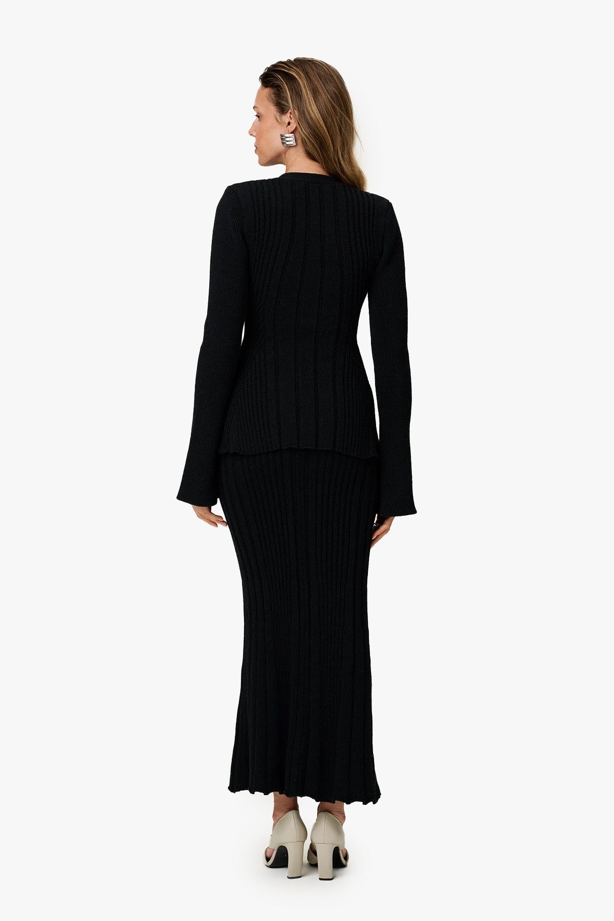 Lugo cardigan in black, designed with structured shoulder pads and a defined waist for an elegant silhouette. The full-length sleeves are finished with wide cuffs for a refined touch.