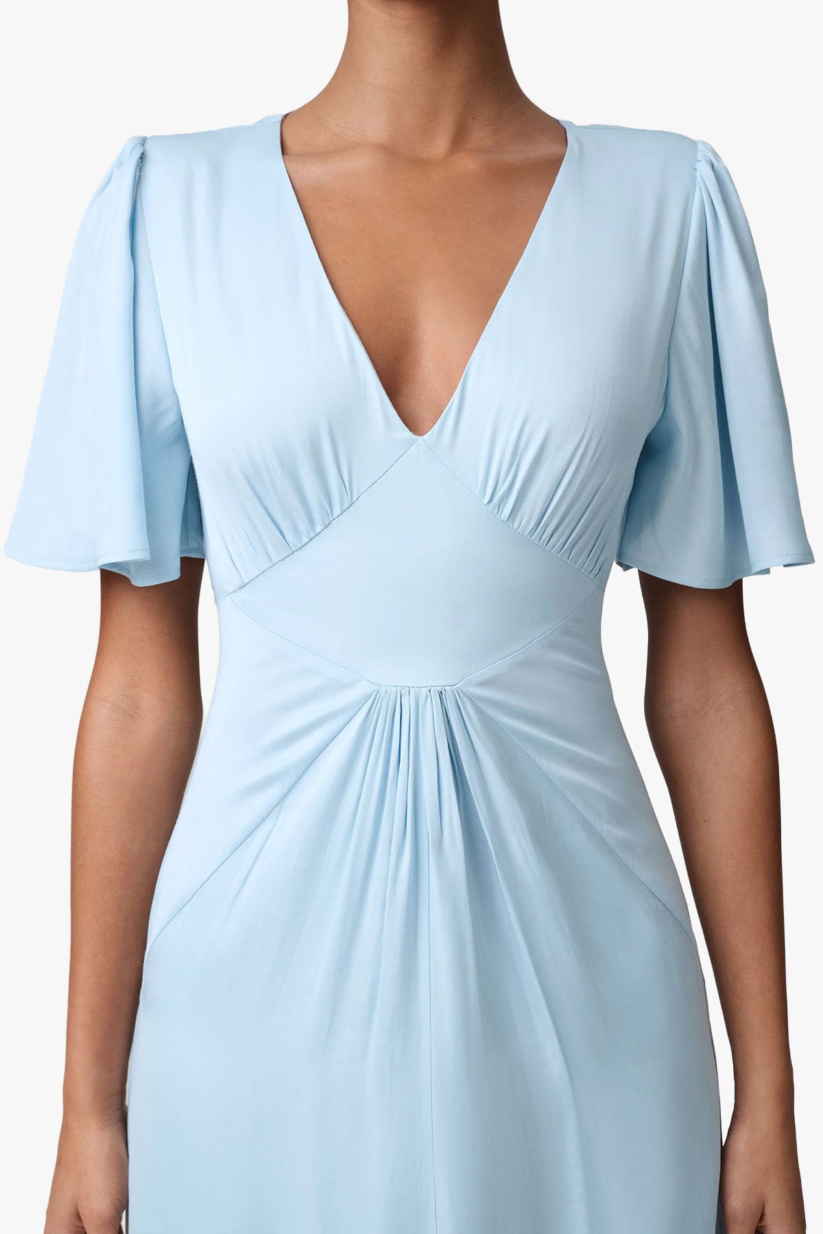 Bari er en elegant kjole i lys blått, designet med myke rynkedetaljer og en flatterende V-formet søm under bysten. Kjolen har diskré skulderputer som gir struktur, kombinert med lette klokkeermer (flutter sleeves) for et romantisk uttrykk.