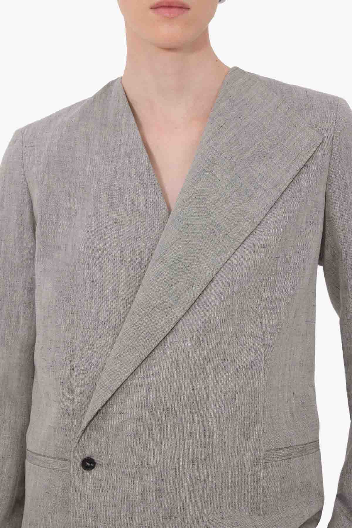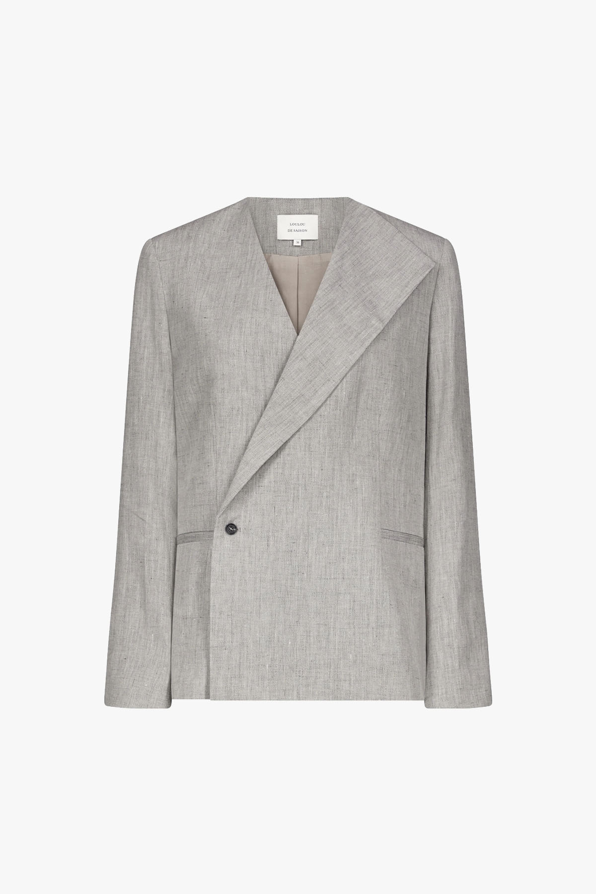 Denne jakken er laget av en melert blanding av lin og bomull, som gir en sofistikert tekstur. Den har en unik asymmetrisk åpning og slag, kombinert med strukturerte skuldre og klassiske stolpelommer.