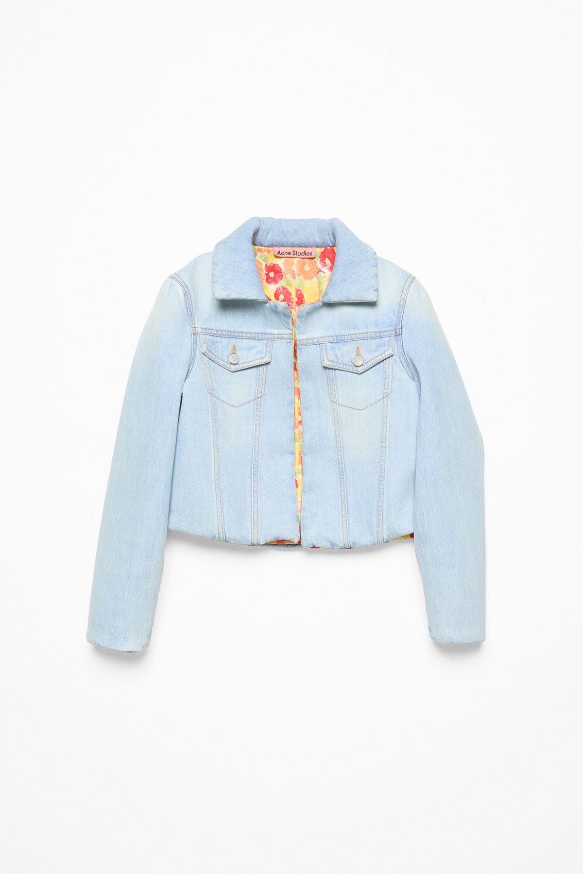This denim jacket features a bonded construction with soft padding, creating a seamless sculptural design. Made from non-stretch regenerative cotton in a vintage ice blue wash, it is detailed with decorative chest pockets and rivet buttons. The cropped length and regular fit offer a modern, structured silhouette.