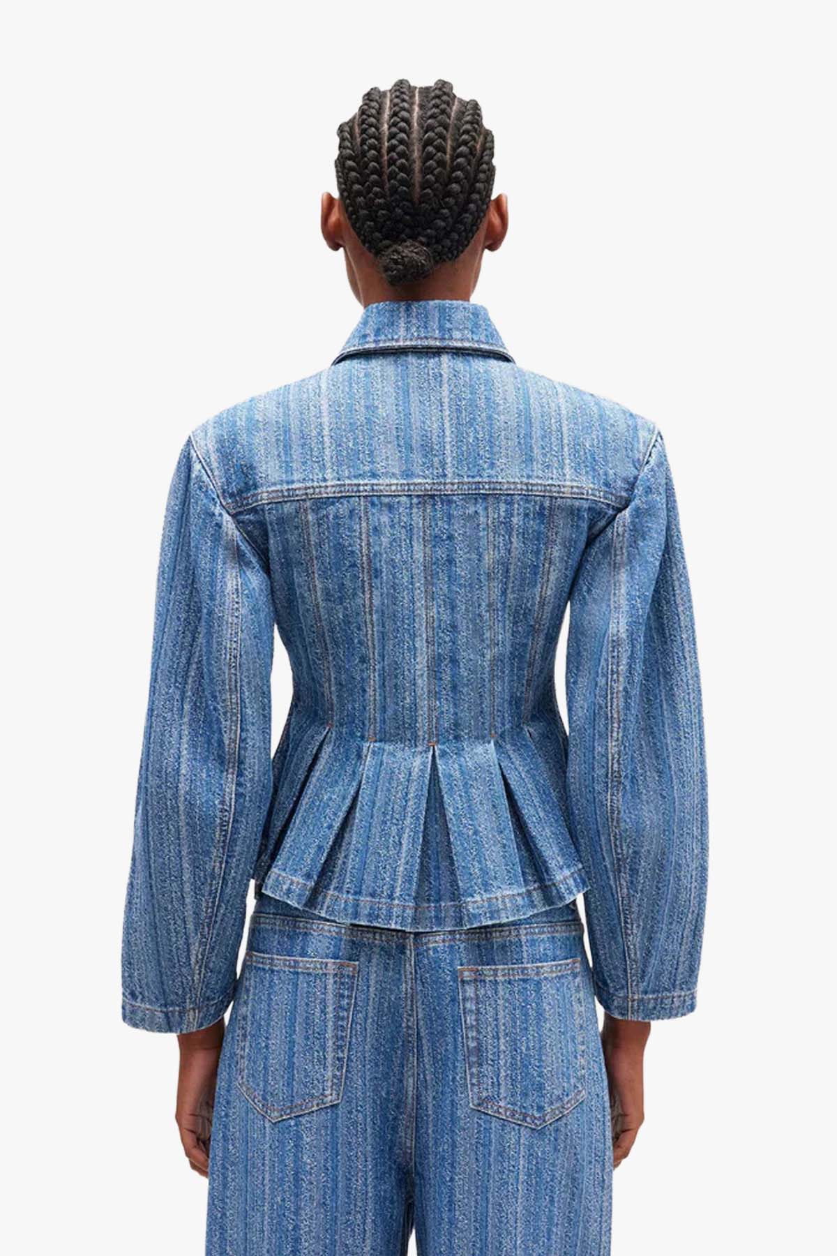 A timeless denim jacket in mid blue stone, featuring a classic collar and front button closure. The jacket includes two chest pockets and a defined waist with pleated detailing that adds a feminine, structured silhouette.