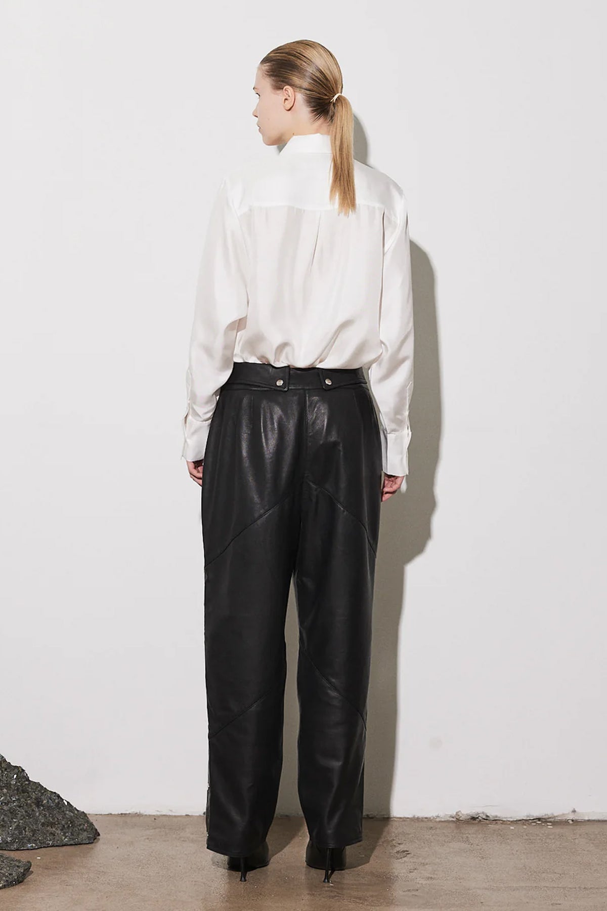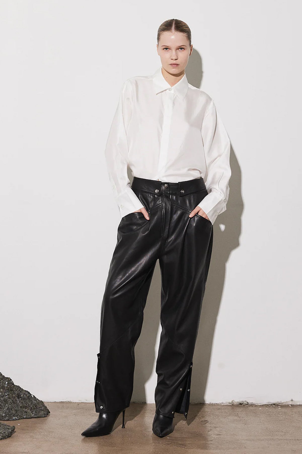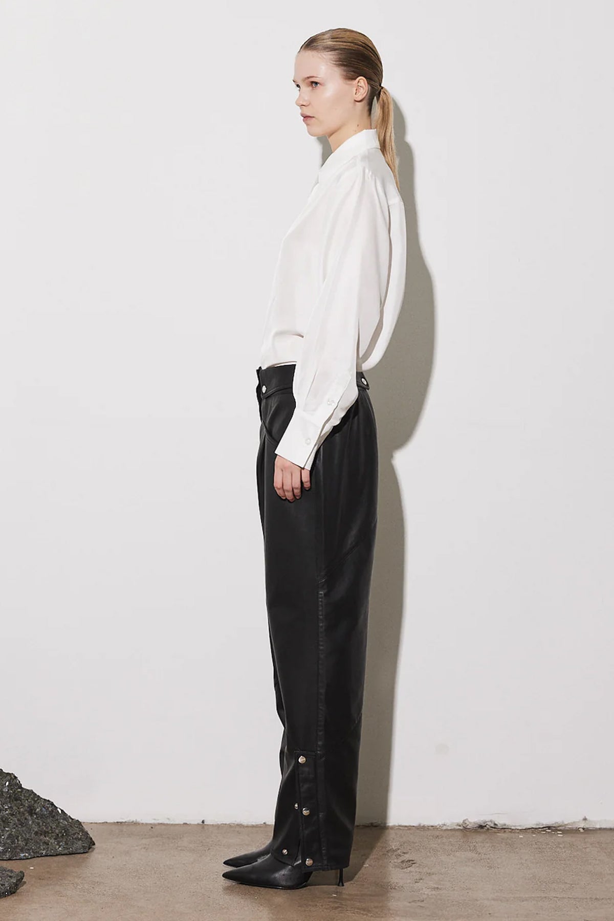 Introducing the Braga shirt, an elegant and minimalist piece crafted from luxurious silk twill. This shirt features hidden buttons at the center front, adding to its sleek design. Available in aubergine, black, and white, the Braga Shirt is perfect for summer and the seasons ahead, serving as both a sophisticated party shirt and a professional business shirt.