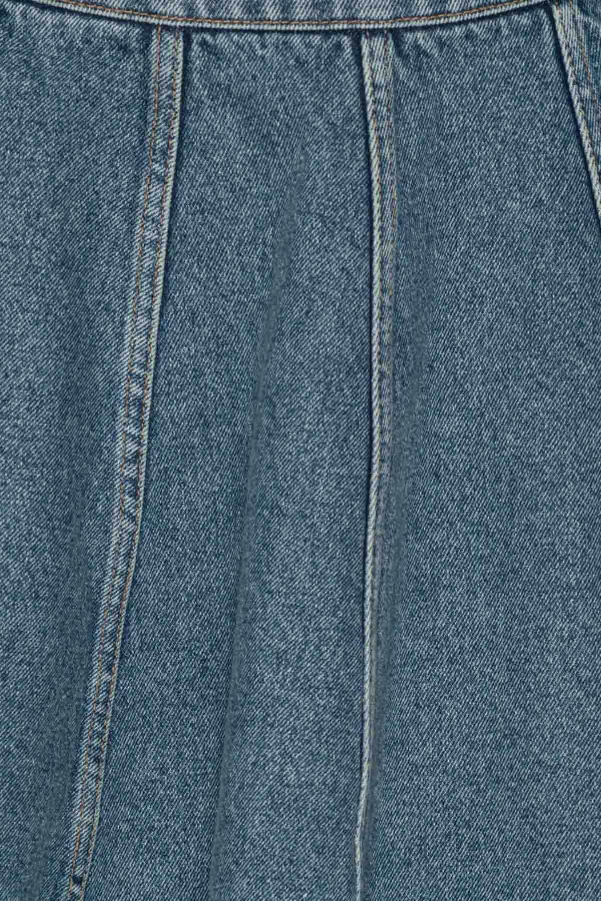 Denim Mini Skirt Blue has an A-line silhouette with structured panels and contrast stitching. It features a back zipper closure and a branded leather patch at the back. The hem is finished with a stitched edge.